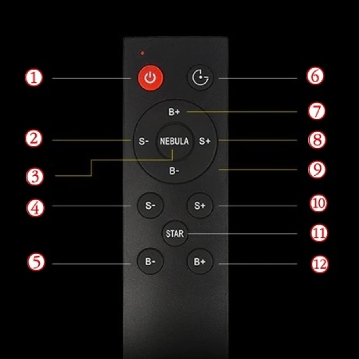У комплект входить пульт дистанційного керування, за допомогою якого можна вмикати проектор і змінювати режими освітлення туманності та зірок.