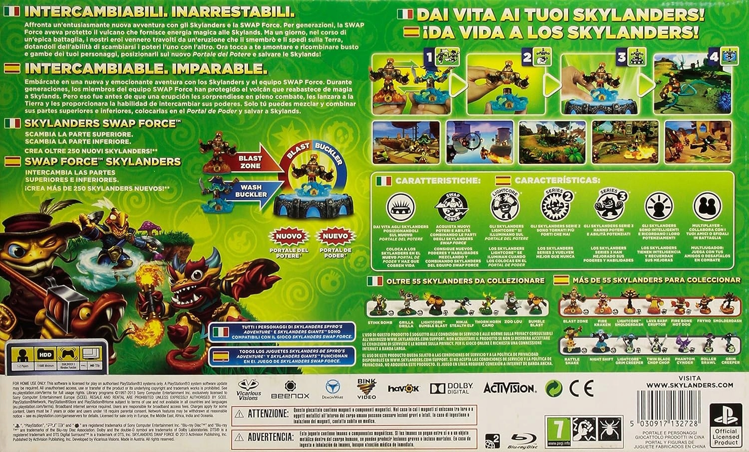 Skylanders SWAP Force — це третя частина серії Skylanders і продовження чудової другої частини Skylanders Giants і відзначеної нагородами Skylanders Spyro Adventure. Вирушайте в нову захоплюючу пригоду разом із Skylanders SWAP Force. Протягом багатьох поколінь Skylanders захищали чарівний вулкан, який їм дала їхня сила. Доки величезна битва не спричинила виверження вулкана, яке розкололи Skylanders надвоє та не впало на землю, давши їм силу злитися! Тепер, окрім того, щоб бути майстром порталу, ви можете комбінувати свої Skylanders за бажанням! Об’єднайте два Skylander в один абсолютно новий Skylander! Зберіть усіх героїв Skylands і створіть понад 256 нових унікальних Skylanders з можливістю комбінування! Пам’ятайте, лише ви можете врятувати Skylands!