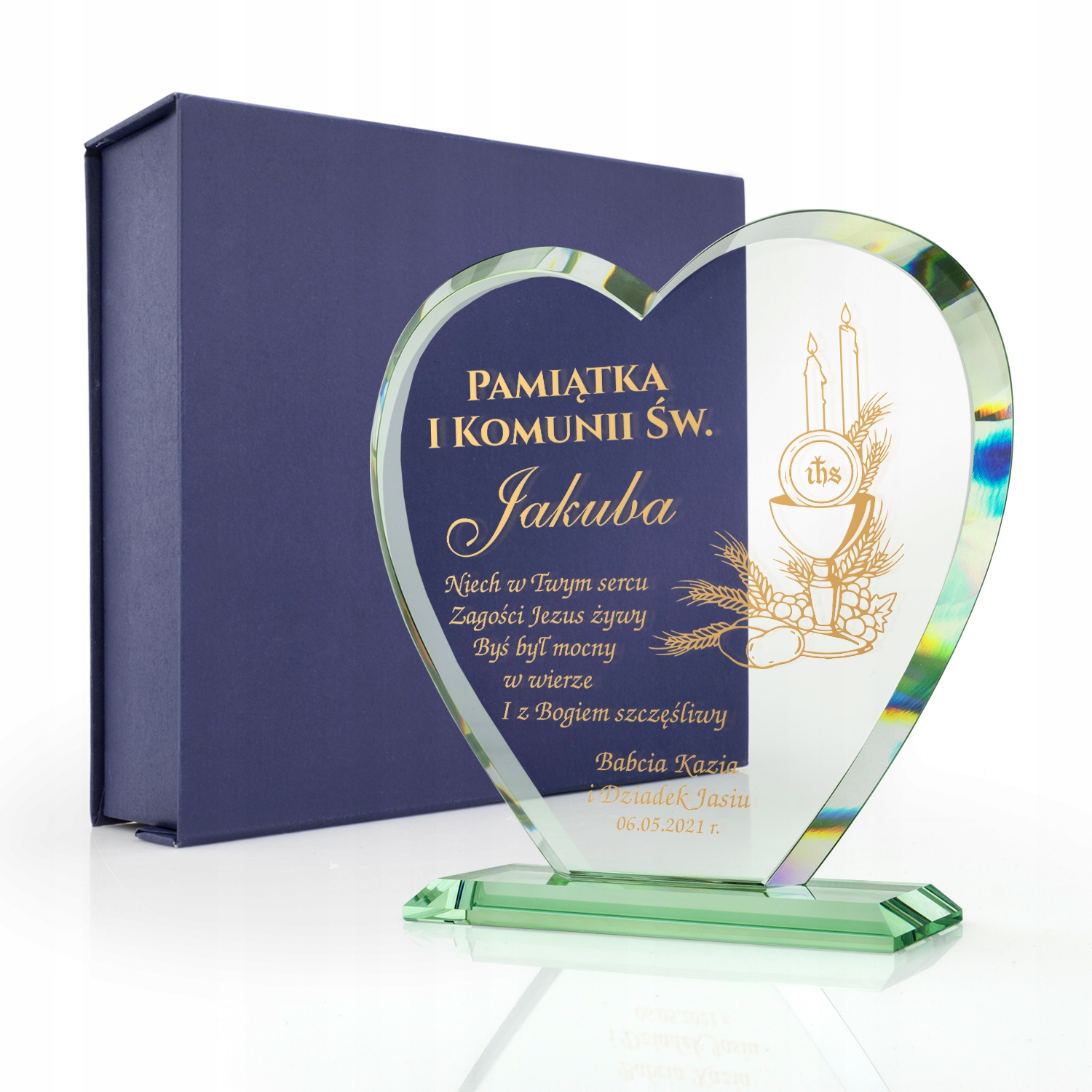Статуетка у формі серця з іменним гравіюванням - унікальний і неповторний сувенір до Першого Святого Причастя. Він стане чудовою прикрасою будь-якої дитячої кімнати. Серце та основа виготовлені з товстого скла, що робить статуетку масивною та стійкою. Він сформований у формі серця і має скошені боки, що надає ефекту рамки. Додатково сердечко упаковане в темно-синю коробку, тому подарунок готовий до вручення.