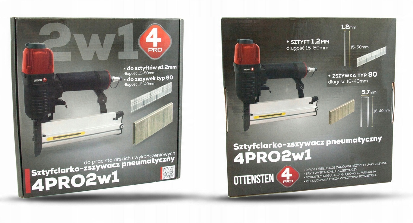 Пневматичний степлер 2в1 4PRO рекомендований як для професіоналів, що займаються фінішною обробкою, так і для всіх, хто виконує дрібні столярні та будівельні роботи. Ідеальний інструмент для домашньої майстерні - два пневматичних інструменти для професійного використання в одній недорогій ціні.