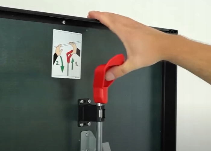 Верхня частина опускається безпечним і контрольованим способом b>, зберігаючи правильне положення. Червона кнопка для розблокування столу видно з обох боків столу.