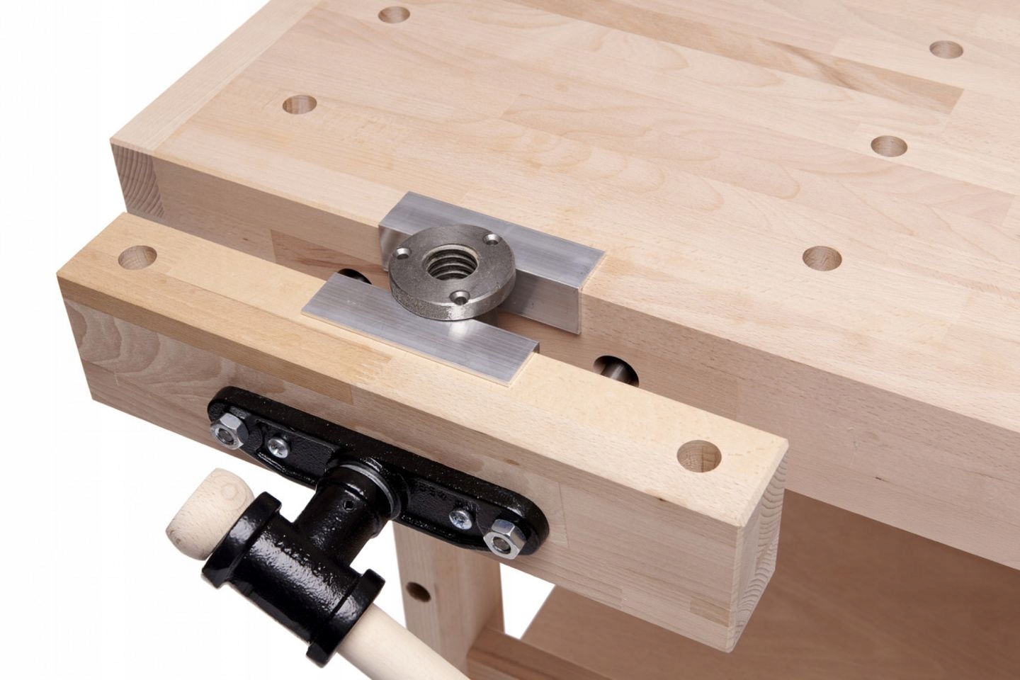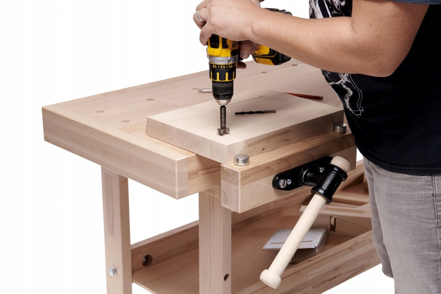 Відкрита полиця є ідеальним місцем для зберігання матеріалів та інструментів. 31 отвір для стійок у стільниці дозволяє монтувати різні матеріали різного розміру, а отвори в ніжках столу дозволяють вертикально встановити заготовку.