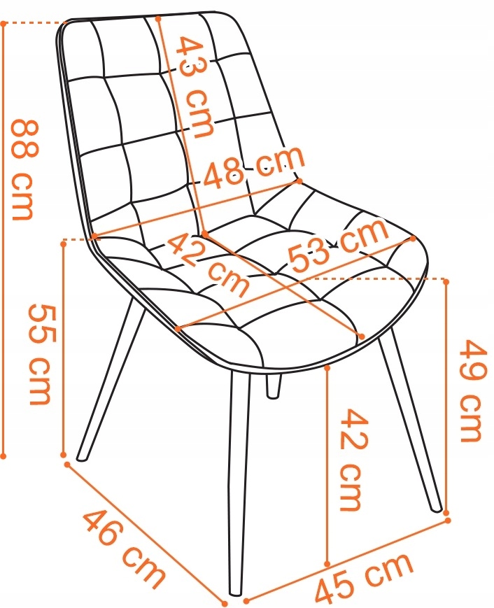 Висота крісла 88 см, ширина 53 см і глибина 60 см. Висота сидіння становить 49 см, що робить його зручним для щоденного використання.