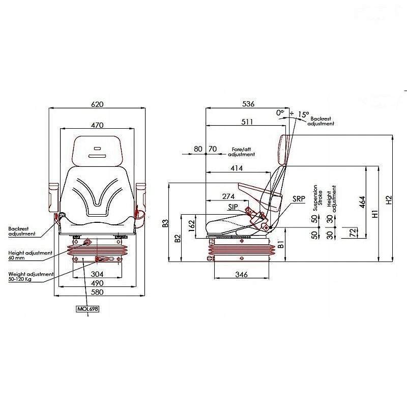 - Відбиття спини 0-15 < Li> Налаштування висоти 60 мм