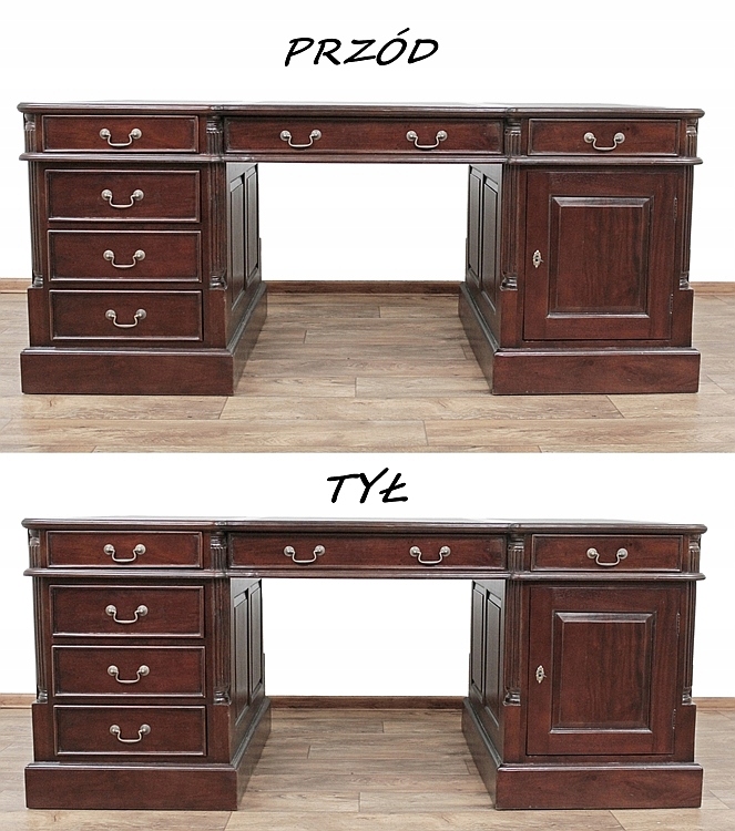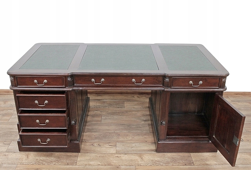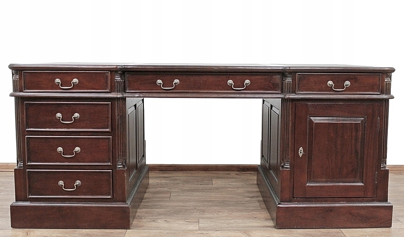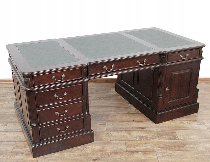 Унікальний дерев'яний предмет меблів з шістьма ящиками та шафою, що замикається з обох боків столу. Письмовий стіл є двостороннім предметом меблів, що є додатковою перевагою. Завдяки йому можна заощадити місце. Люди, які працюють над цим, сидять один проти одного. Це дає великі можливості для облаштування приміщення. Виглядає красиво. Все це прикрашено металевими ручками.