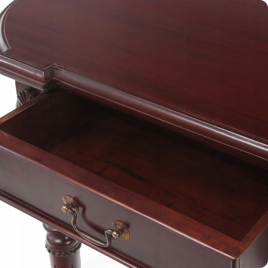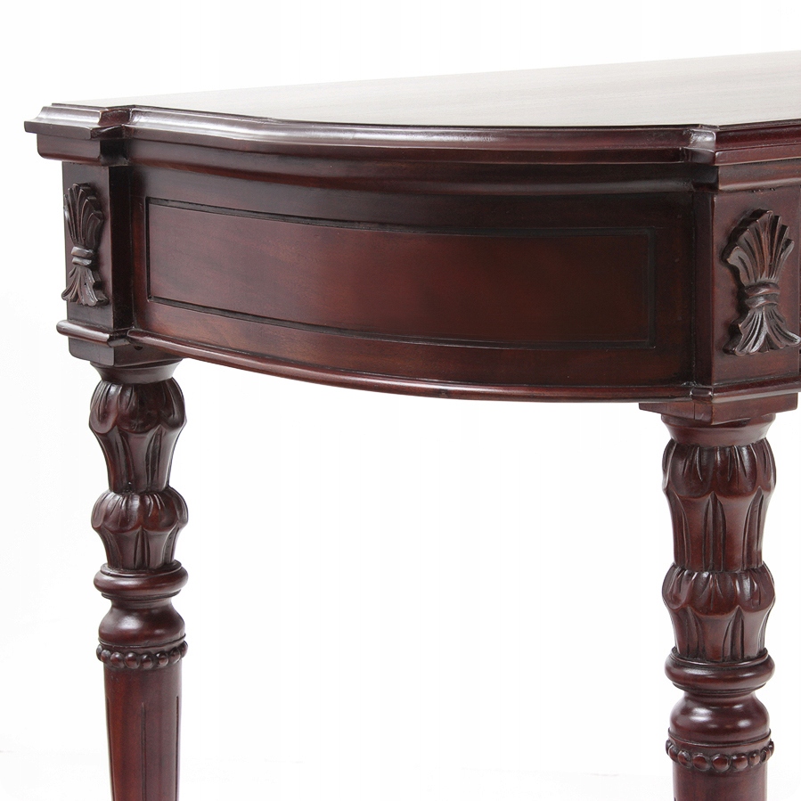 Консоль з червоного дерева. Має гарне різьблення ручної роботи. Тверда деревина, лакована.Спереду є функціональний висувний ящик з ручкою. Форма предмета меблів і різьблення підтверджують його унікальність.