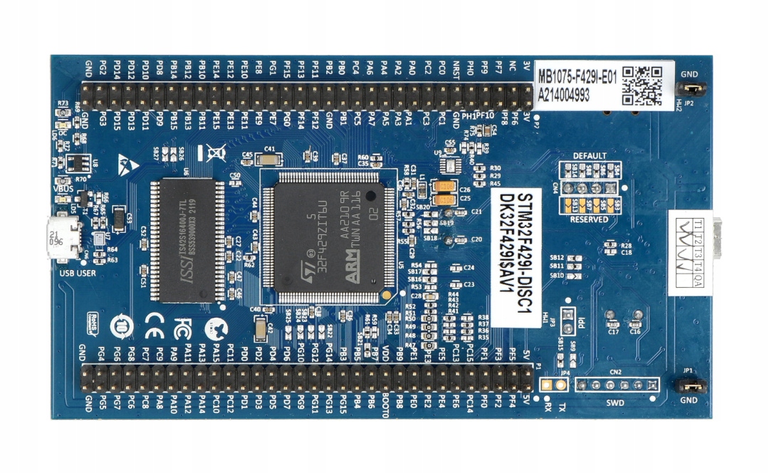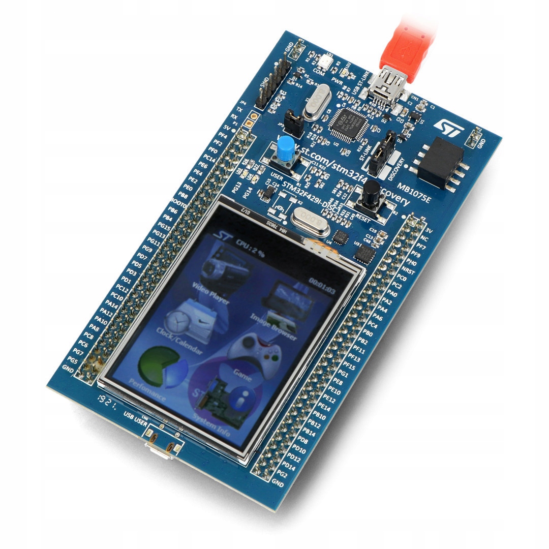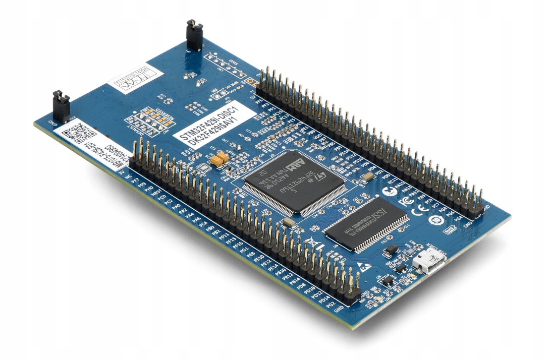 Комплект розробки на базі мікроконтролера STM32F429ZIT6 (180 МГц, 2 МБ Flash, 256 КБ RAM, ядро Cortex-M4F ARM). Плата також має 3-осьовий гіроскоп, 2,4-дюймовий QVGA TFT LCD сенсорний екран і ST-LINK/V2-B програматор/дебагер.