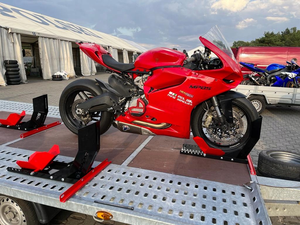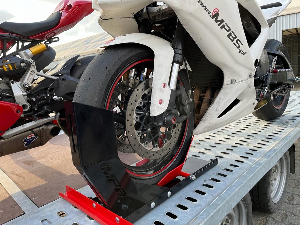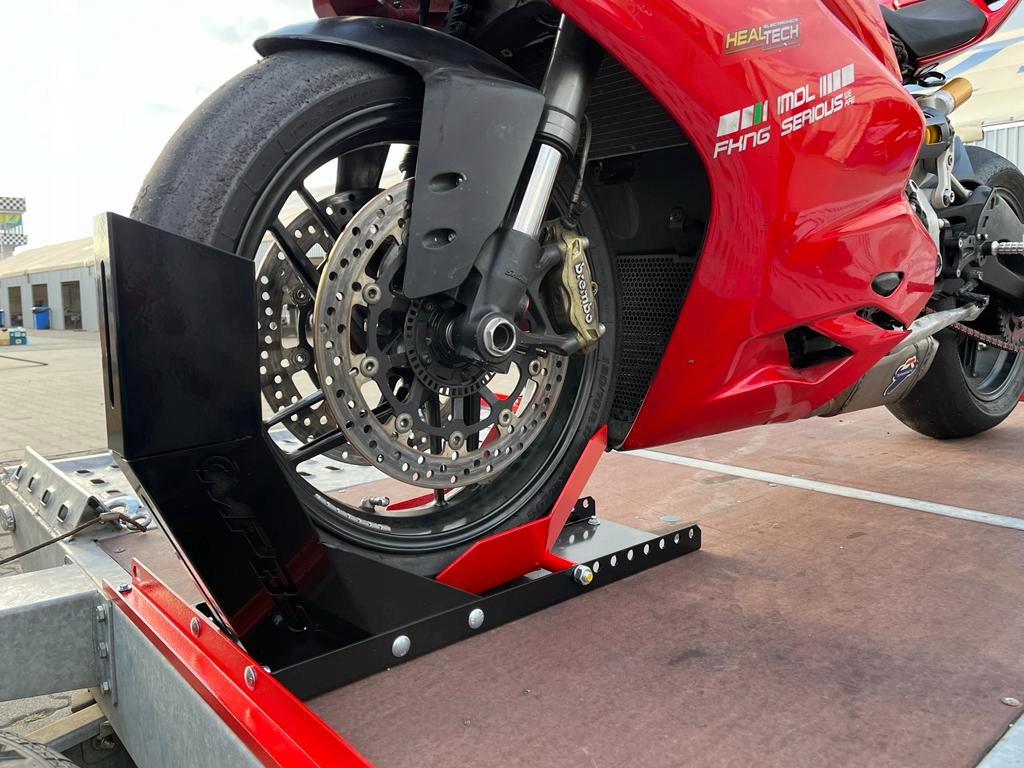 Мотопідставка для переднього колеса дозволяє швидко і стійко поставити мотоцикл у вертикальне положення. Він ідеально підходить для транспортування мотоцикла на причепі, його використовують у майстерні чи гаражі, що полегшує технічне обслуговування чи тривалу стоянку.