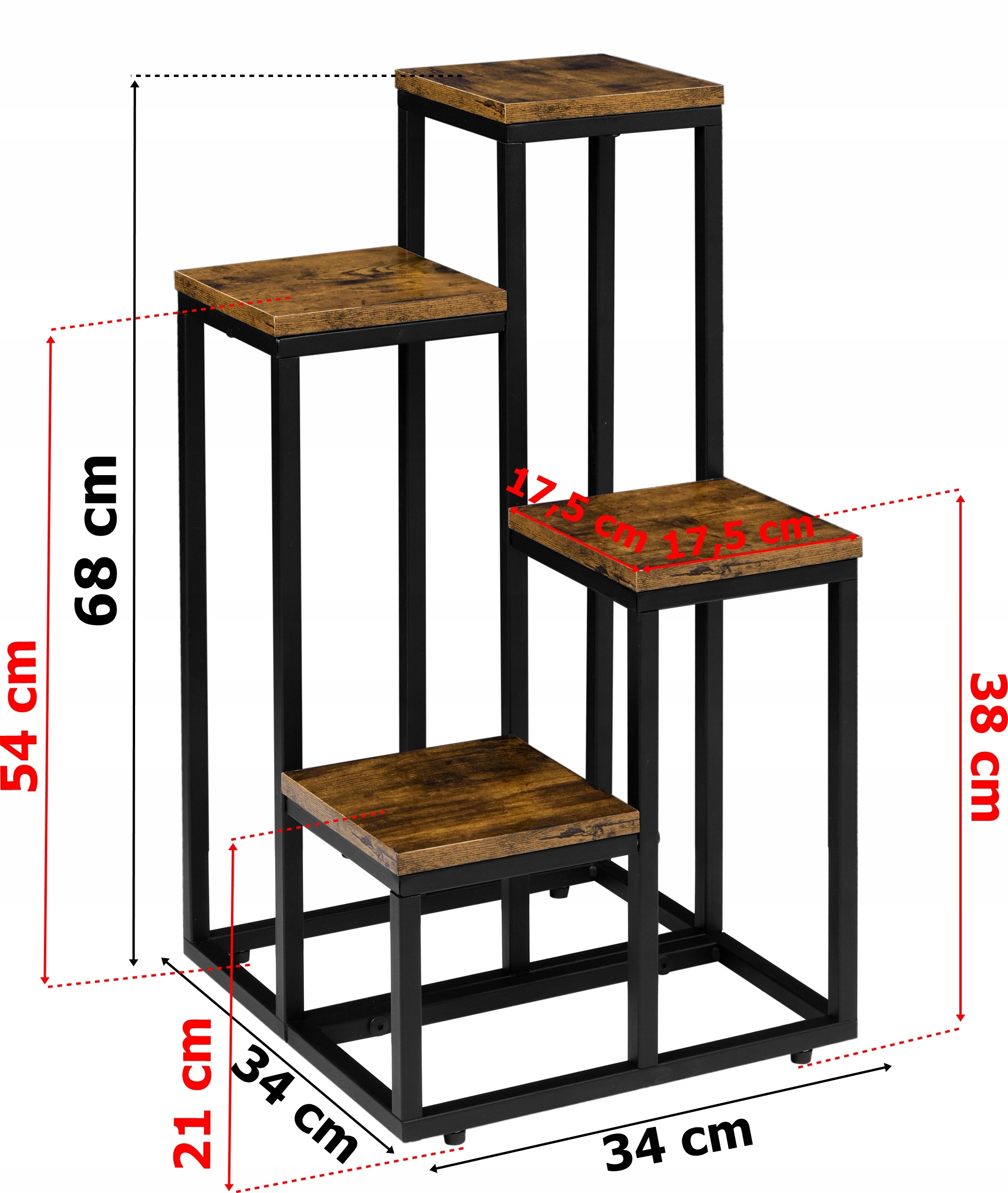 Mogren - це міцна підставка для квітів виготовлена зі сталевих профілів пофарбована порошковою фарбою та ламінована дошка кольору зістареного дуба. Характеризується простим дизайном та привабливим дизайном, який впишеться в будь-яке сучасно мебльоване приміщення в лофт, класичний або індустріальний стиль. Підставка для квітів має міцну сталеву конструкцію та 4 стійкі полиці для квітів і прикрас, навіть важких. Має захисні накладки в основі. Виготовлений з матеріалів найвищої якості з увагою до найдрібніших деталей. Він ідеально підходить для демонстрації квітів і демонстрації їх унікальних цінностей. Mogren — це унікальна підставка для квітів із міцною структурою та цікавим дизайном, який неможливо ігнорувати.