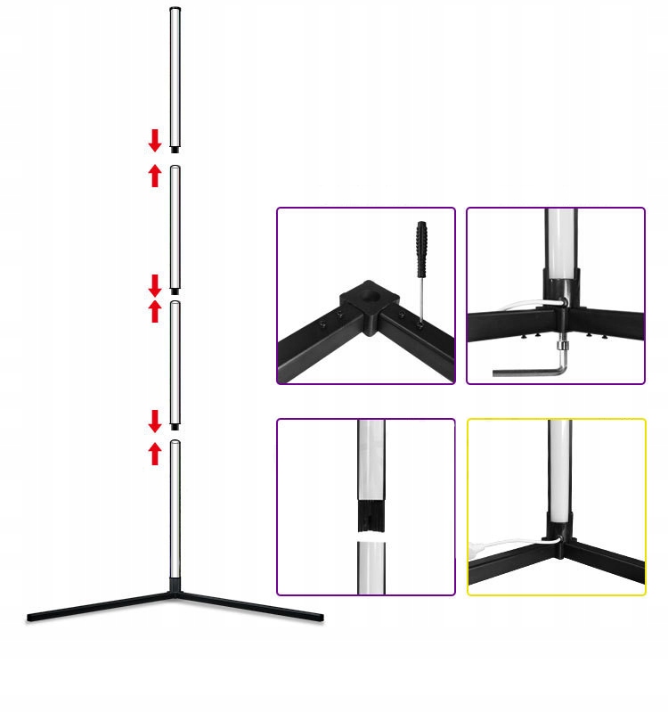 Потім, відповідно до наших потреб, ми можемо зібрати світильник з 2, 3 або 4 модулів. Довжина кожного модуля приблизно 40 см. Максимальна висота світильника 165 см, мінімальна 85 см.