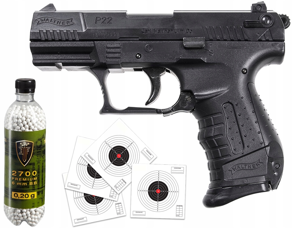 Пістолет Walther P22 ASG - 230 FPS, Hop-Up, RIS rail + 2 магазини на 20 куль + 2700 куль 0,2 г + 10 мішеней 14x14 см.