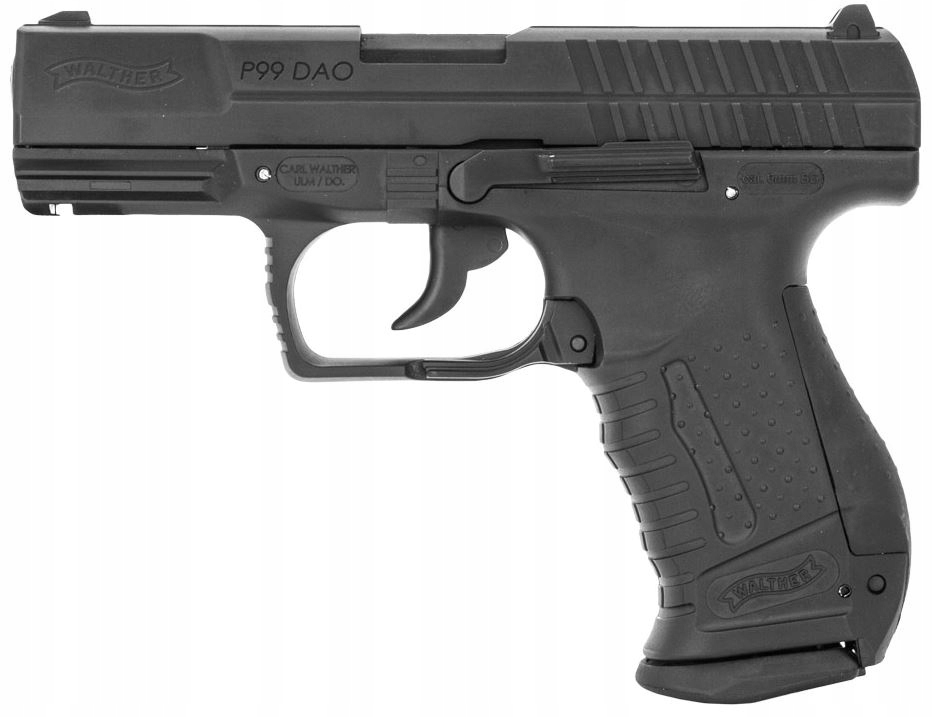 Walther P99 DAO – сильна страйкбольна копія CO2, газова система BlowBack, металевий замок, металевий магазин із 15 кульками, 520 FPS, сила близько 2 Дж.