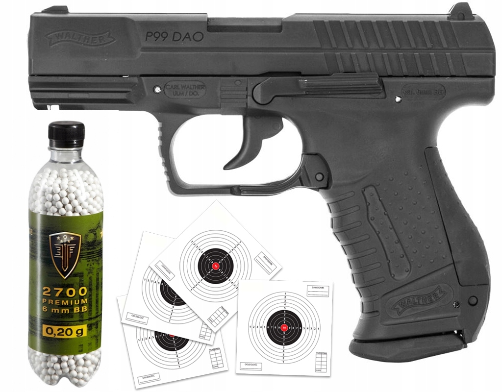 Walther P99 DAO - сильна страйкбольна копія CO2, газова система Blow-Back, металевий замок, магазин на 15 BBs, 520 FPS, сила приблизно 2J + 2700 BBs 0,20 g + 10 ДИСКІВ 14x14 см.