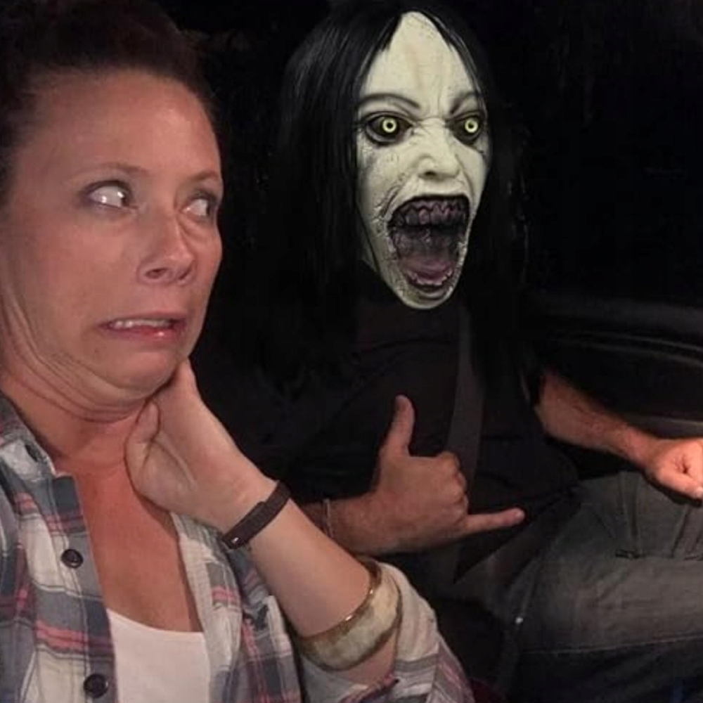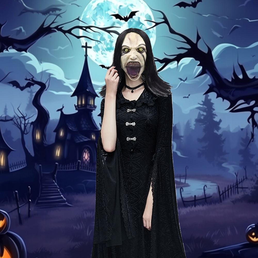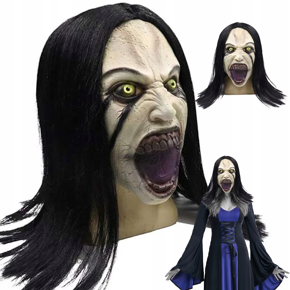 ПОВНА ПІДТВЕРДЖЕННЯ: латексна маска на всю голову із зображенням демонічної жіночої привиди зі спотвореним обличчям, відкритим ротом і розпущеним волоссям. Ефект надзвичайно реалістичний і жахливий з усіх боків!