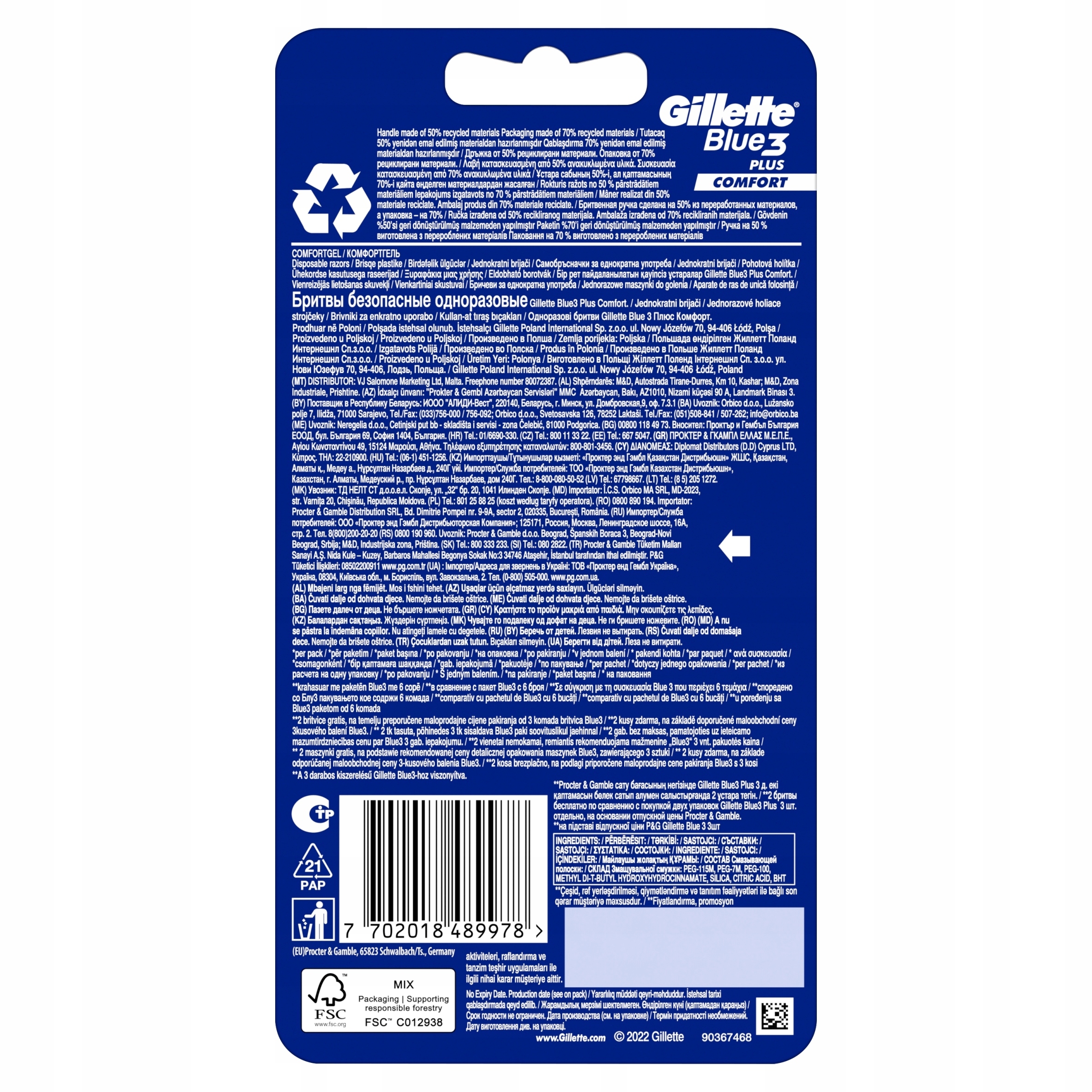 Одноразова бритва, яка забезпечує комфортне гоління до 10 разів? Це можливо завдяки бритві Gillette Blue3 Comfort із 3 хромованими лезами, які повторюють контур обличчя, і рухомою головкою, яка адаптується до форми обличчя. Покращений Lubrastrip з технологією Comfortgel, що активується водою, для максимального комфорту. Бритва оснащена нековзкою гумовою ручкою для кращого контролю та лезами, які легко мити, для 100% кращого очищення (порівняно з Blue II Plus).