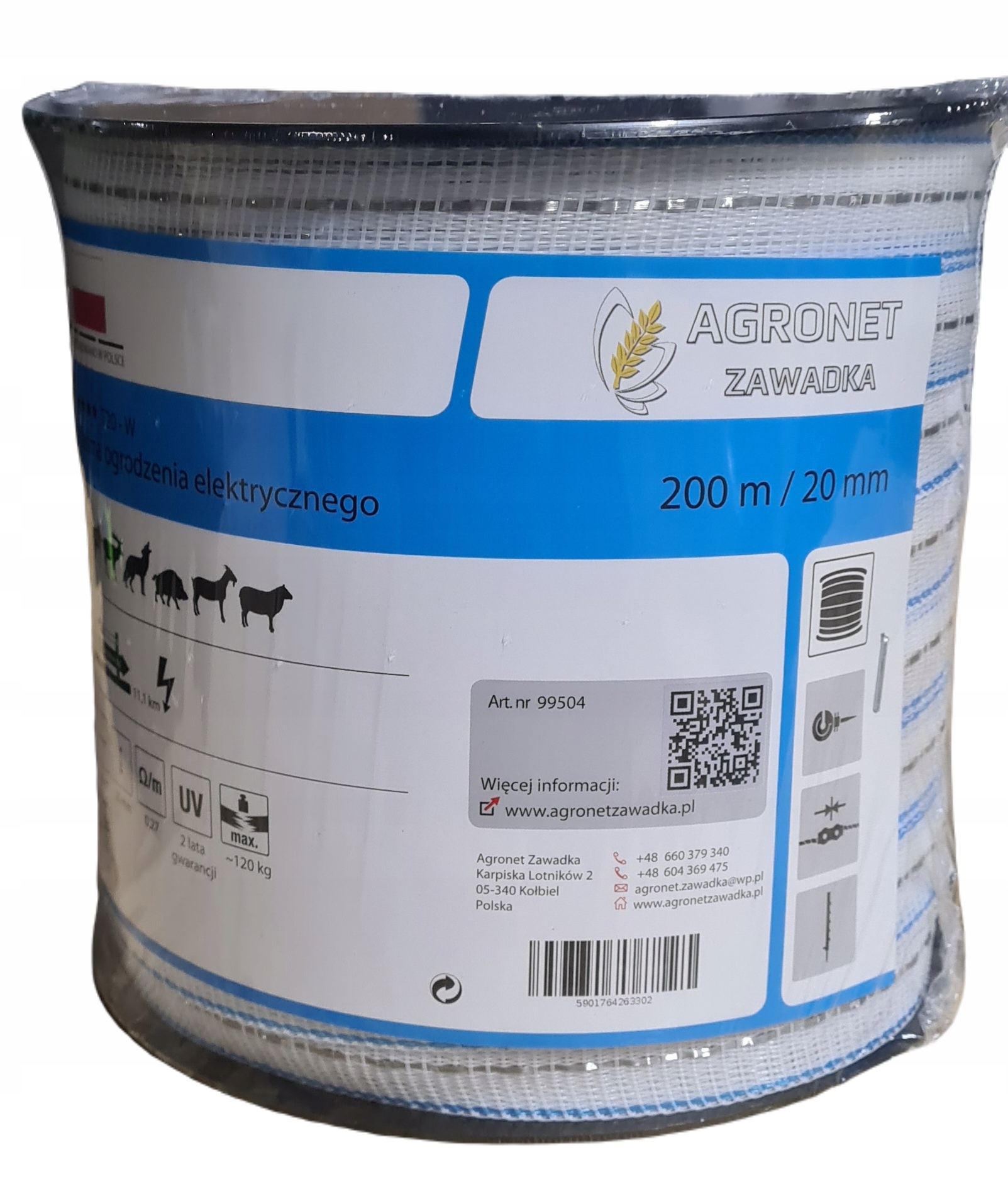 Стрічка AGRONETZAWADKA - продукт з дуже хорошими параметрами довговічності, виготовлений у Польщі. Стрічка для електроогорож виконана з міцного матеріалу, стійкого до УФ-променів, що значно підвищує довговічність виробу. Відмінні властивості передачі електричних імпульсів. Котушка містить 200 метрів кабелю 20 мм завширшки. Це стрічка з найвищими технічними параметрами, яка відмінно підходить для середніх і довгих огорож. Стрічка, про яку йде мова, розроблена з урахуванням потреб вимогливих клієнтів, які очікують високої якості за розумною ціною.