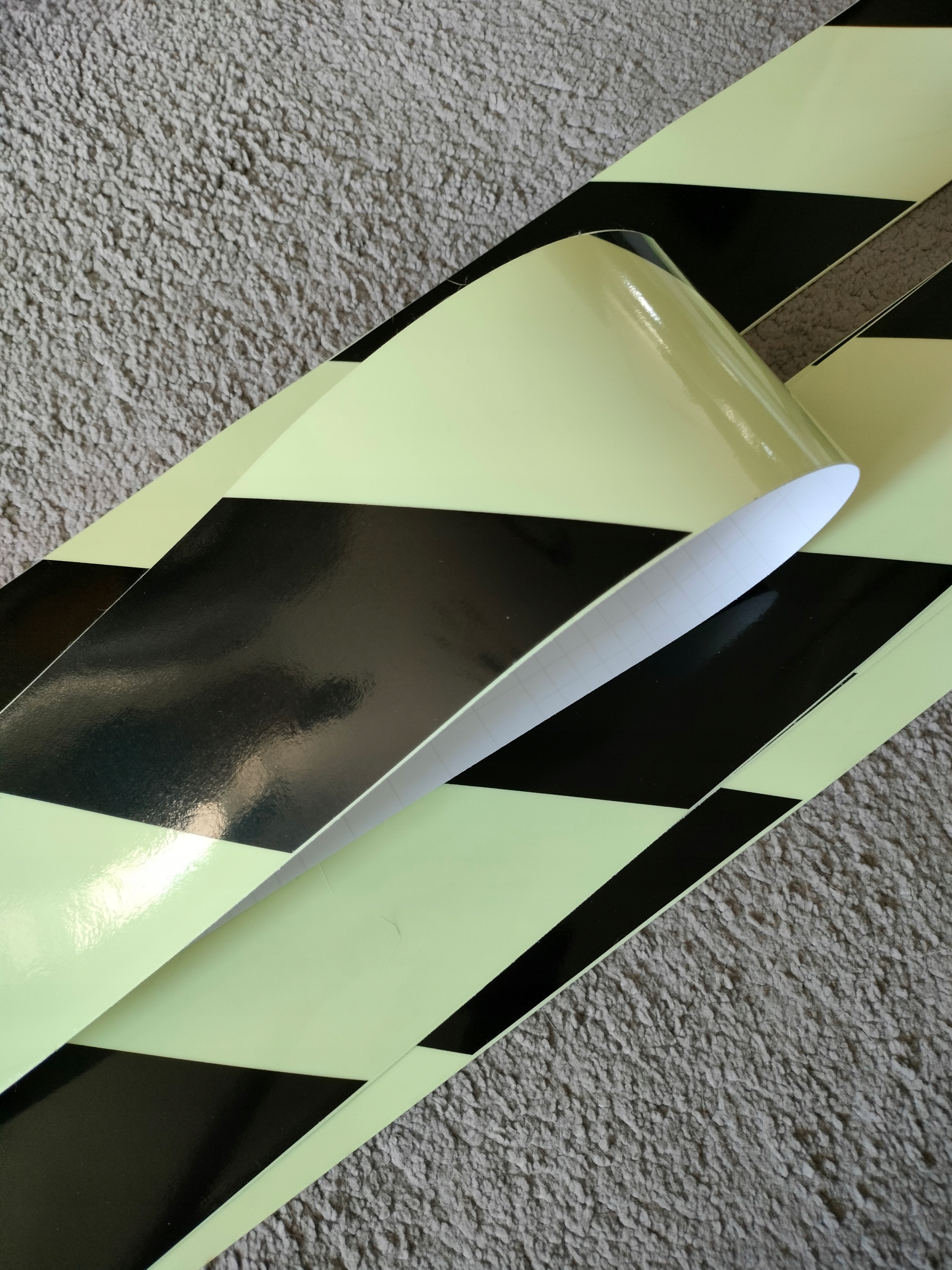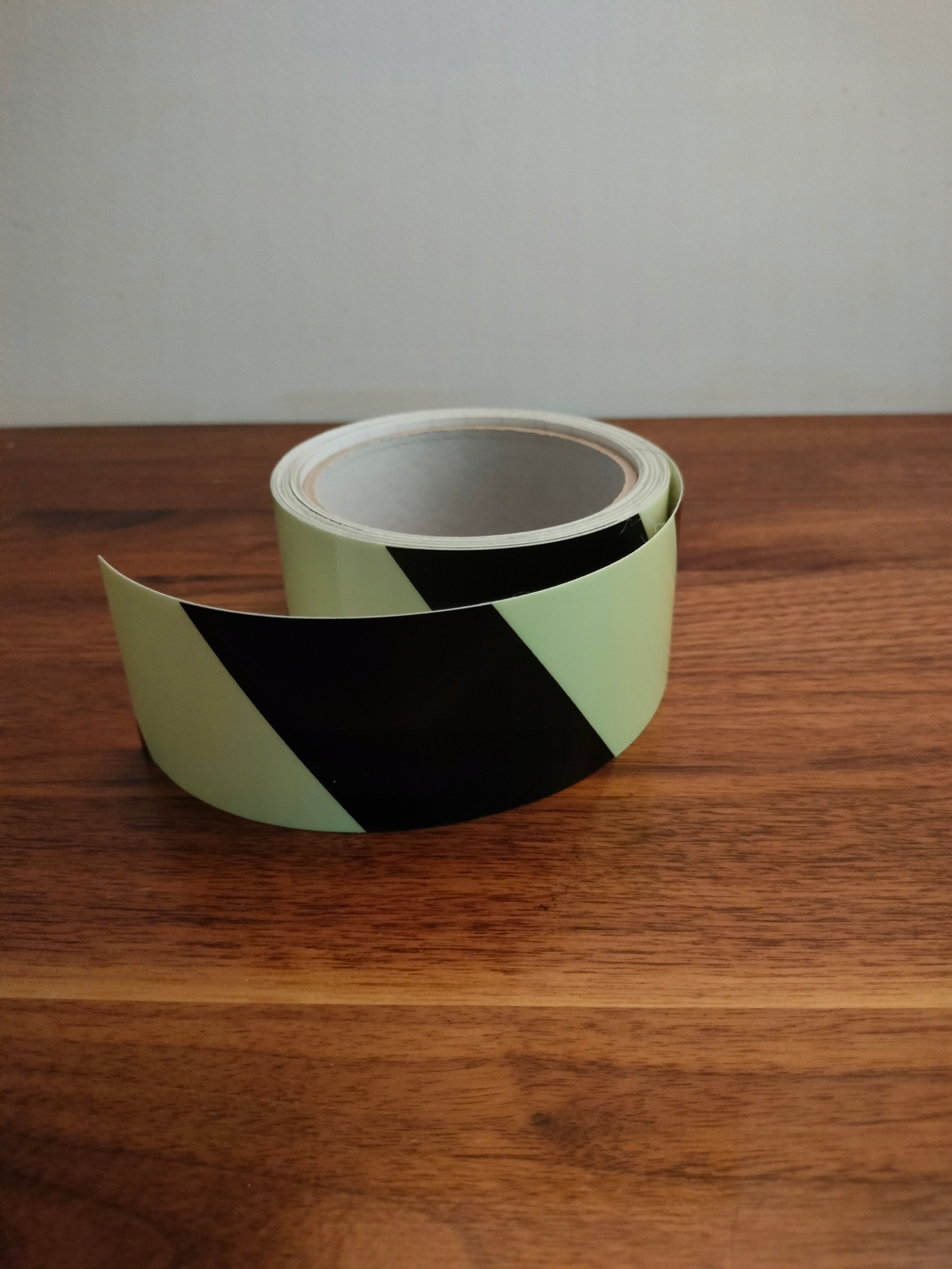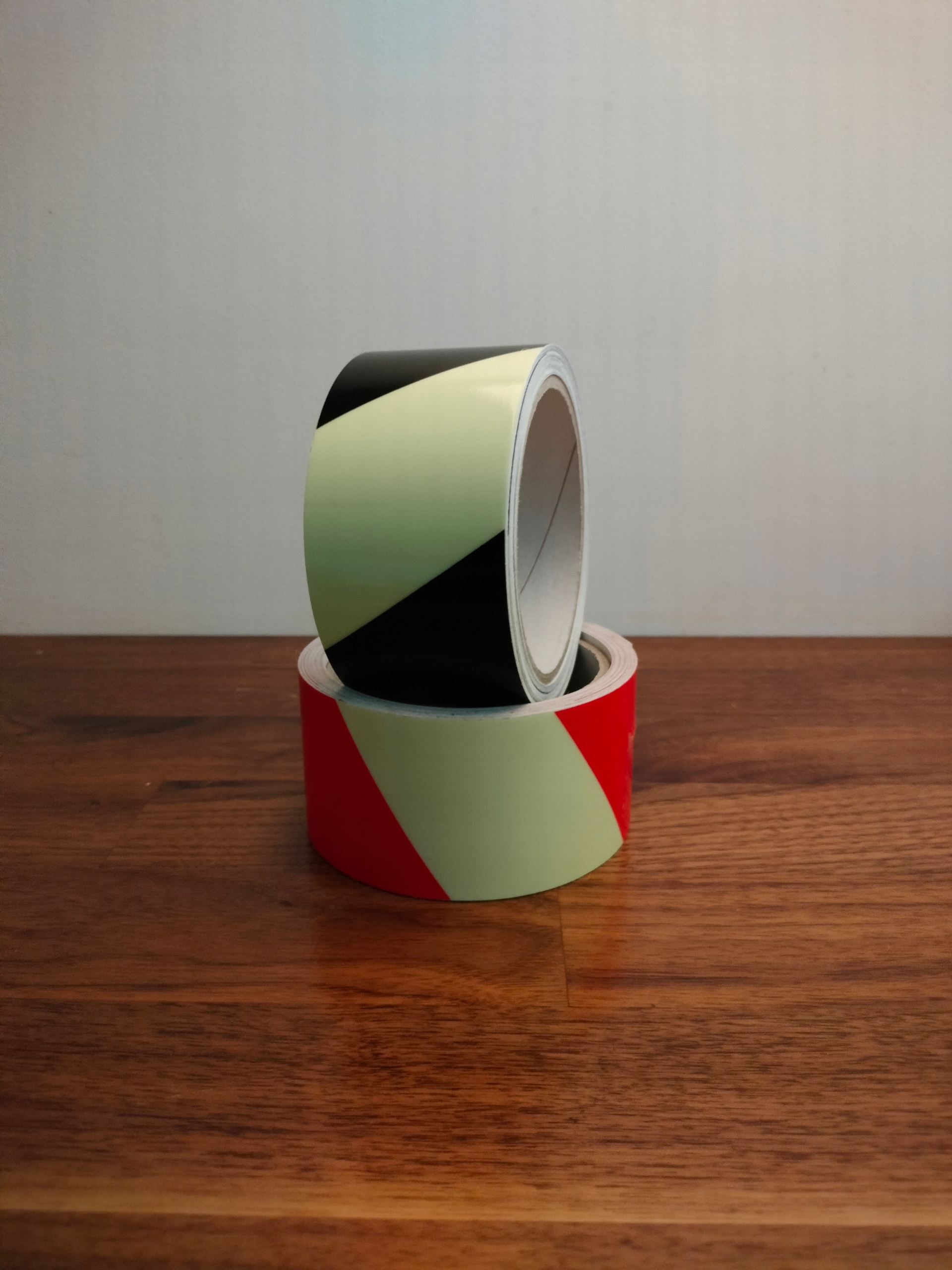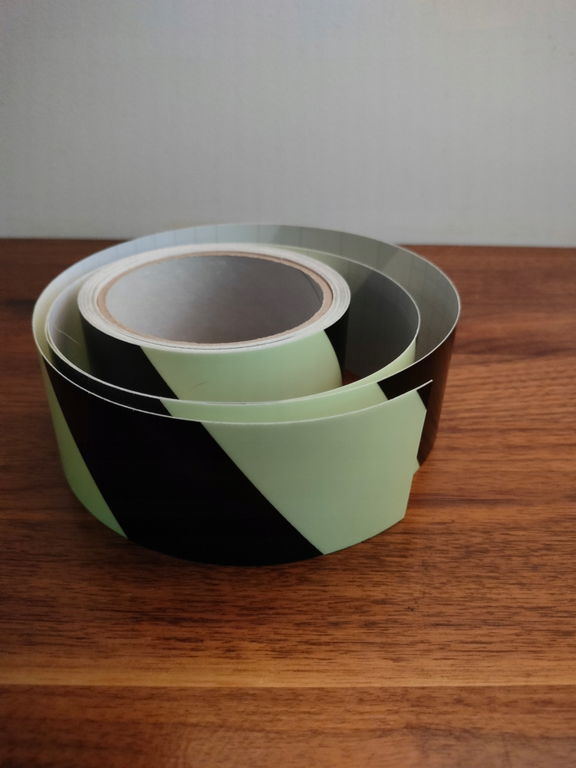 Односторонні клейкі фотолюмінесцентні стрічки з ПВХ плівки. Вони покращують видимість електричних вимикачів, замків, розеток і поручнів у темряві.