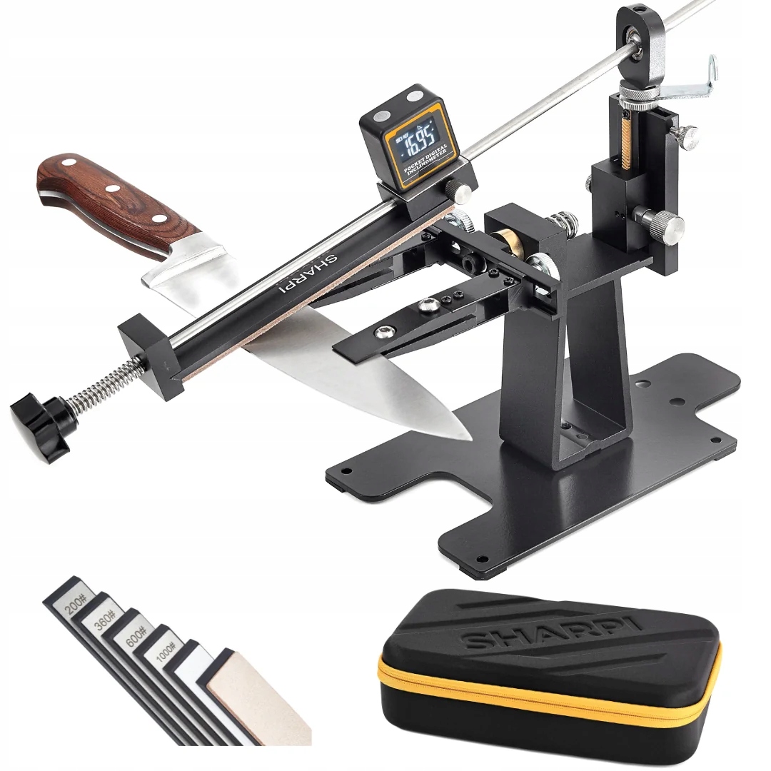 1. Налаштуйте систему SHARPI (за бажанням прикрутіть до стільниці). 2. Вставте ніж, відцентруйте його в лещатах і натисніть. 3. Установіть кут за допомогою інклінометра, уточніть за допомогою мікрорегулювання, зафіксуйте напрямок. 4. Градації: 200/360 → 600/1000 → кераміка → шкіра. 5. Поверніть ніж у лещатах і повторіть з іншого боку. Контроль кута Інклінометр (налаштування перед роботою) + мікрорегулювання Стабільність Сталева основа, гумові ніжки, отвори для шурупів заступник Регульовані губки, обертання без відкручування Кам'яний формат ~150 × 25 мм (сумісність з Edge-Pro/Hapstone) Набір абразивів SHARPI Diamond 200/360/600/1000 + кераміка + шкіра Транспорт/Зберігання Валіза EVA з формованою піною
