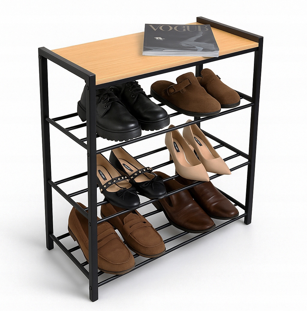Практична і суцільна взуттєва шафа - це ідеальне рішення, якщо ви хочете подбати про замовлення в передпокої, гардеробу чи коридорі. Ця металева взуттєва підставка з 4 поличками вмістить багато пар взуття, при цьому зайнявши мало місця.