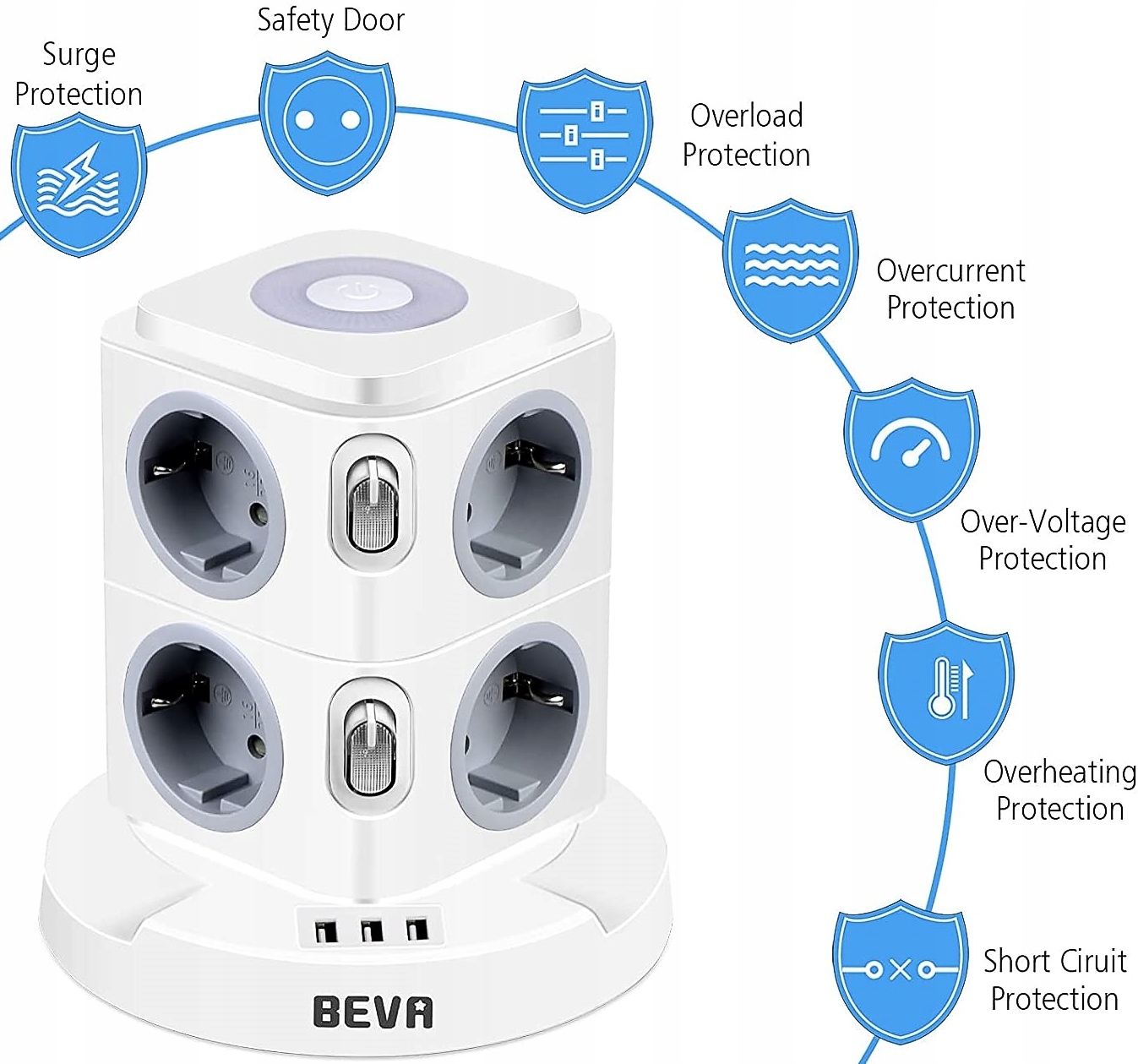 - Многоразовий захист: подовжувач живлення BEVA може забезпечити захист від перевантаження, перенапруги та короткого замикання для забезпечення безпеки підключених пристрої, спеціальна конструкція захищає дитину від ураження електричним струмом через випадкове вставлення пальців у смужку. Вогнетривкий матеріал