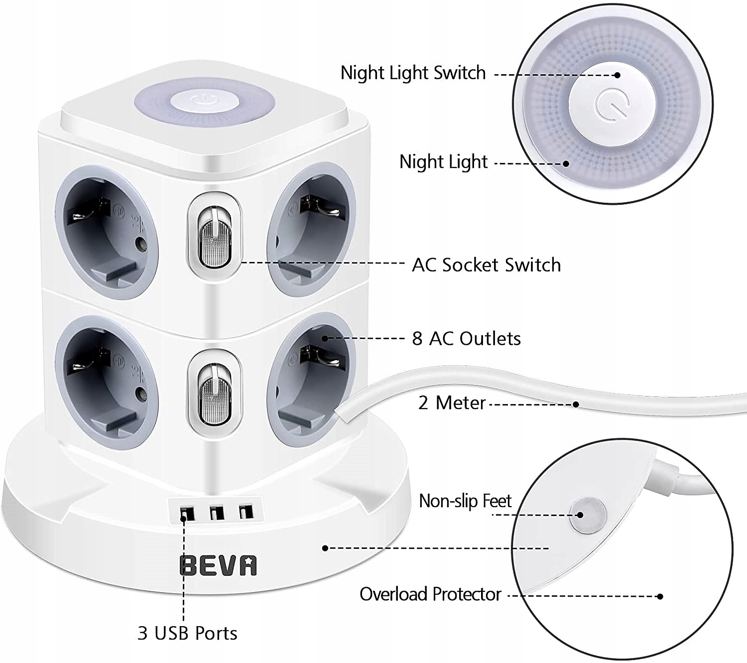 ПОДОДІВЧИК ЖИВЛЕННЯ 11-В-1 ВІД ВІДОМОСТІ КОМПАНІЇ BEVA ІЗ ЗАХИСТОМ ВІД ПЕРЕНАПРУГИ ТА ПЕРЕВАНТАЖЕННЯ 8 ТРАДИЦІЙНИХ РОЗЕТОК + 3 USB-ПОРТИ + СВІТЛОДІОДНИЙ НІЧНИК З 3 РЕЖИМАМИ СВІТЛЕННЯ