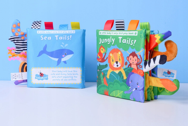 Мультисенсорна розвиваюча книга для найменших, історія про тварин з особливим доповненням - хвостами з різною текстурою та матеріалом.