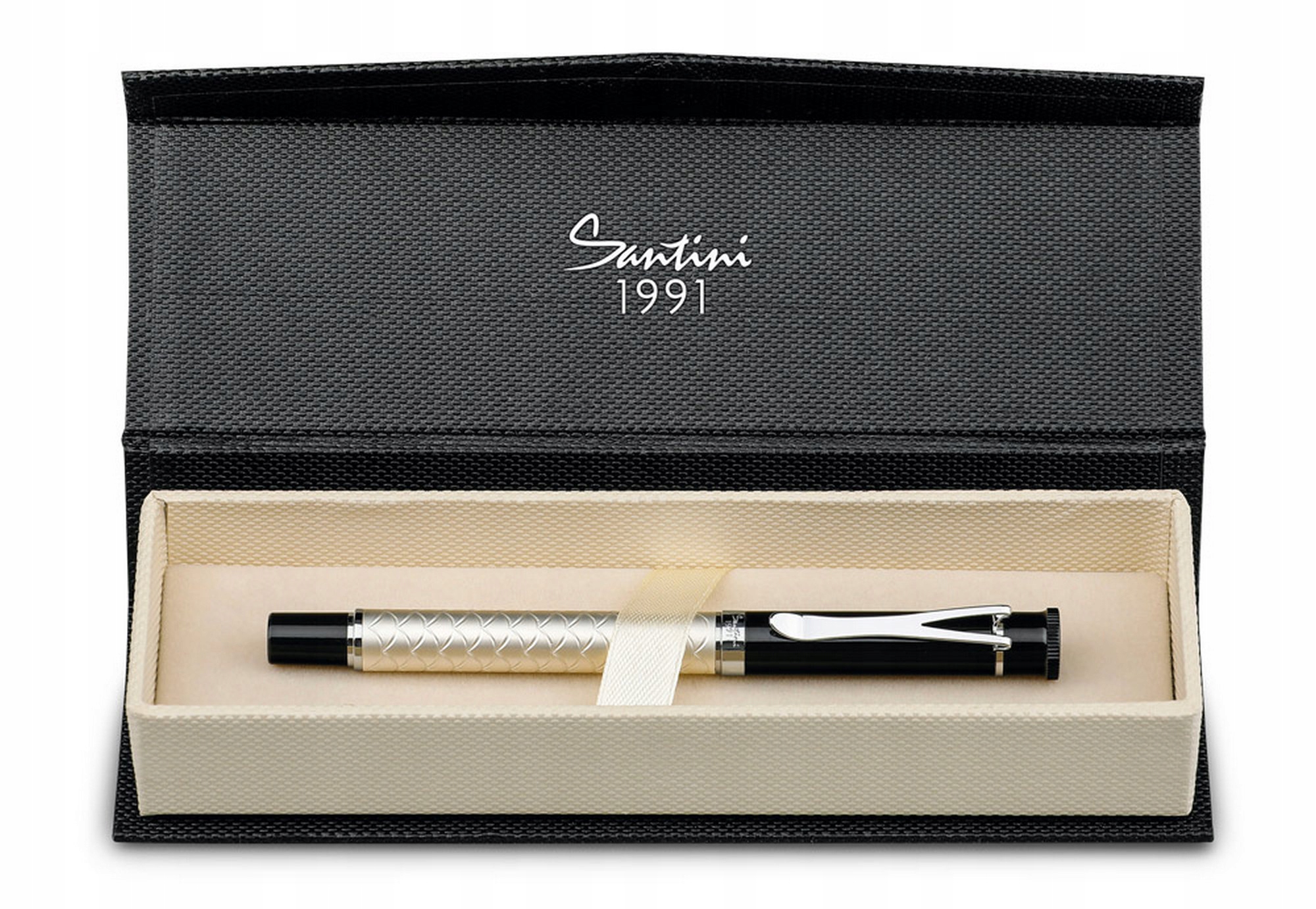 Перова ручка з найпопулярнішою прямою лінією. Ідеально збалансований, суцільно металевий, прикрашений тисненням по всій довжині перламутрового корпусу. Ковпачок і кінчик ручки покриті блискучим чорним лаком. Класичне, декороване, сталеве перо найпопулярнішої товщини F. На металевій лицьовій частині вигравірувано логотип «Santini». Ручка оснащена поршнем для забору чорнила та одним синім стартовим картриджем. Елегантність доповнюється красивою упаковкою, яка відповідає стилю та кольорам ручки.