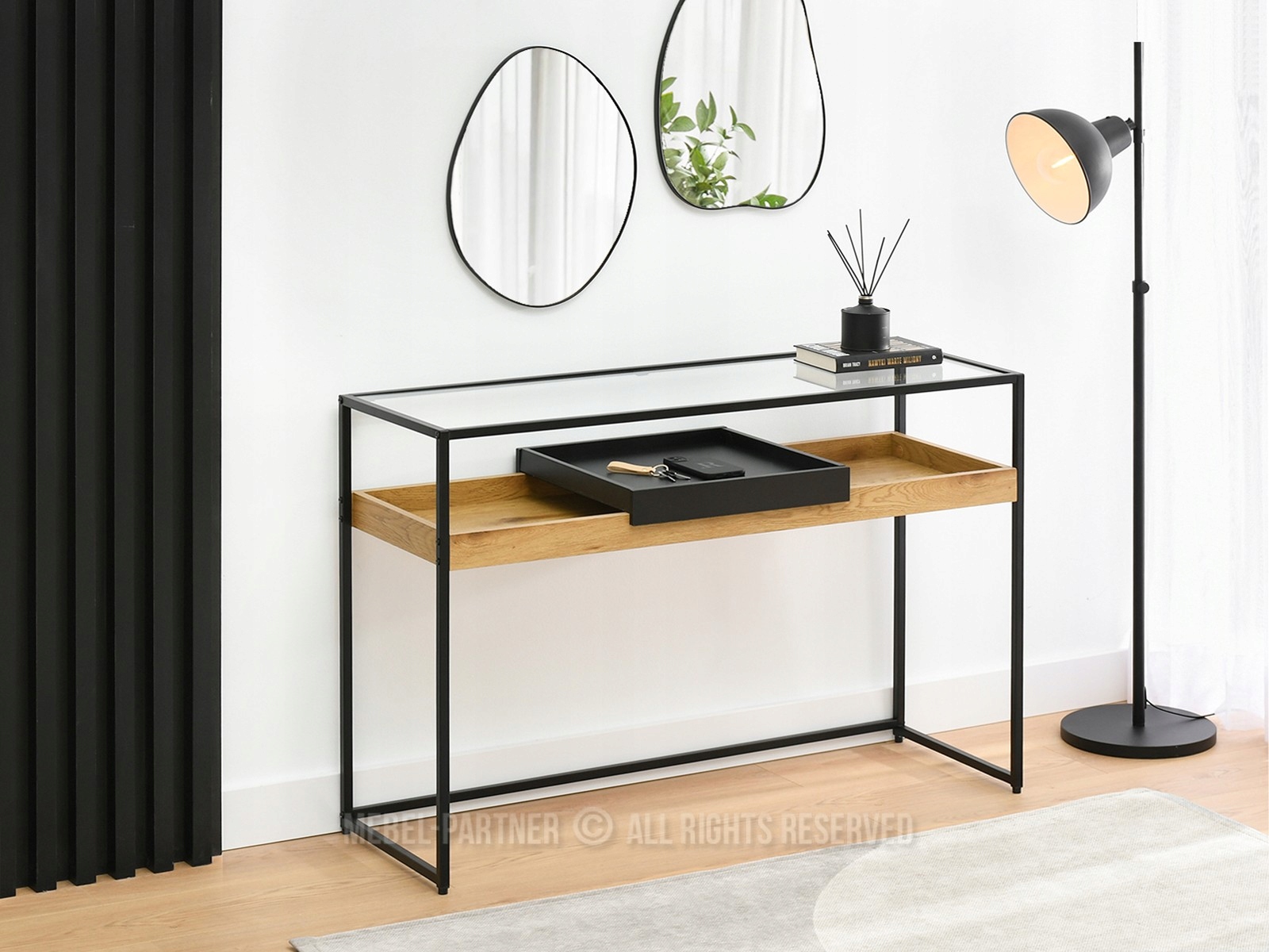 Ця струнка меблі на чорній рамці - це квінтесенція сучасного дизайну, який буде чудовим у кожному просторі. Скляний верх додає тонкої елегантності та легкості, тоді як дубова полиця вводить природний, теплий акцент. Чорне розширення та обробка кадру підкреслюють промисловий стиль, надаючи консолі чіткий характер. Завдяки компактним розмірам та практичним рішенням, таким як регульовані ноги, консоль чудова у передпокої, вітальні чи офісі.