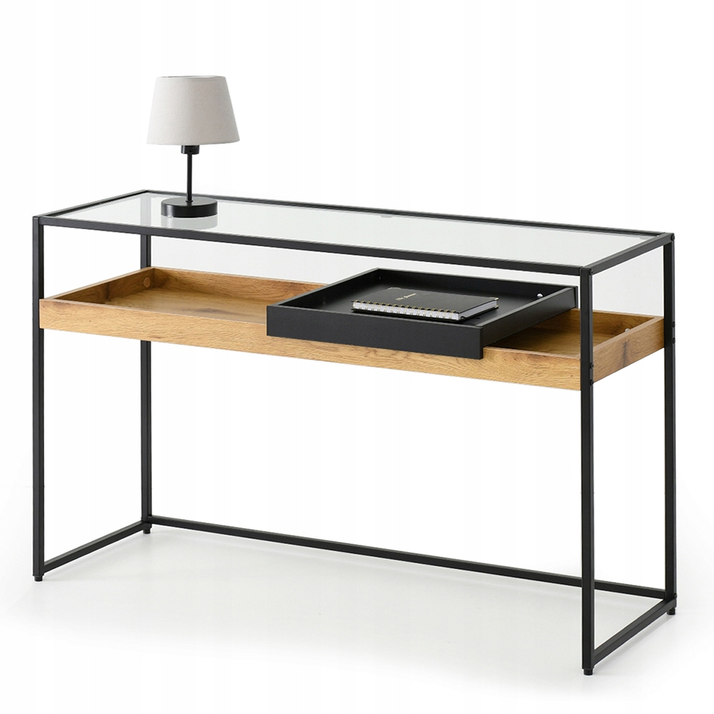 NOWOCZESNA DĘBOWA KONSOLA ZE SZKLANYM I PÓŁKĄ Z TACKĄ BLATEM ELIAS