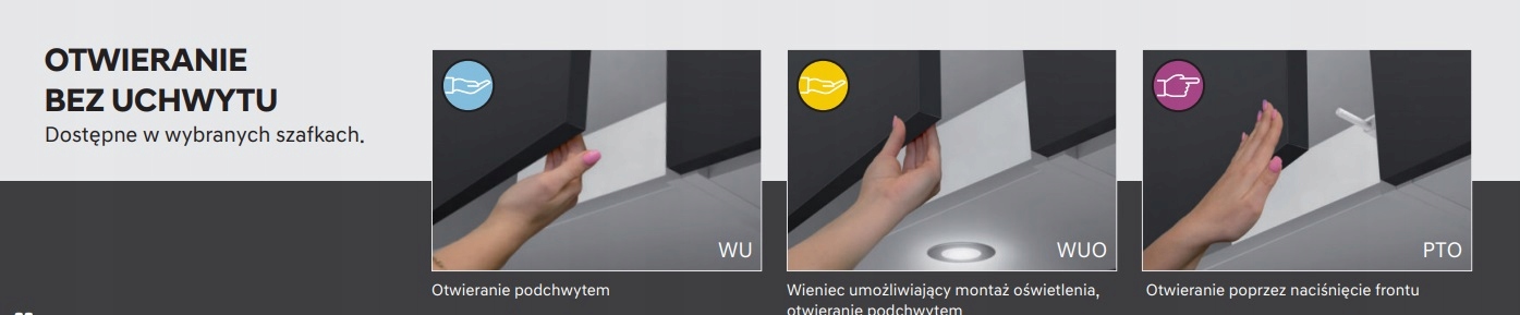 Завдяки цим трьом програмам ви можете вибрати спосіб відкриття верхніх фасадів. Це дуже цікаве і оригінальне рішення в поєднанні з модними кольорами, яке привнесе в кімнату елегантність, сучасність і стриманий, елегантний спокій.