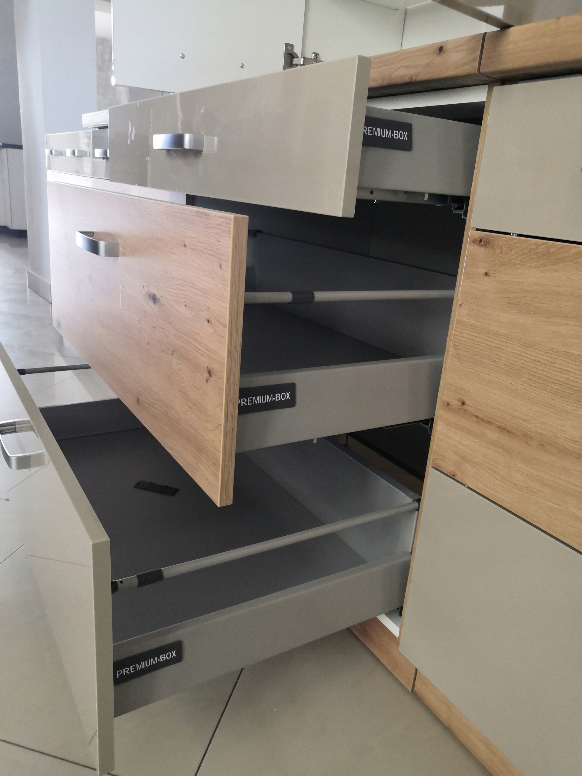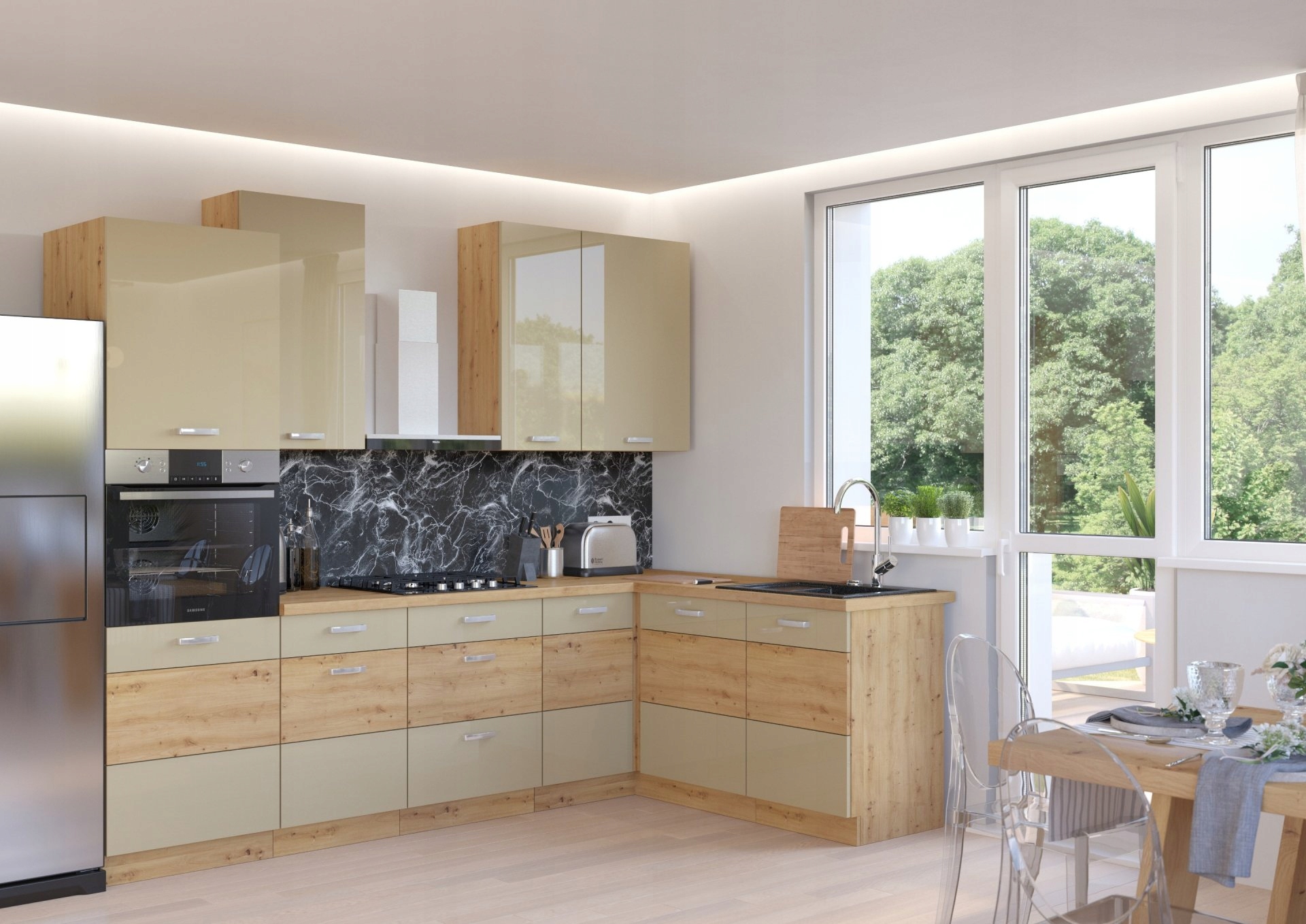 НА ФОТО НИЖУ, КУХНЯ В КАПУЧІНО КОЛОР ГЛЯНС / ДУБ ARTISAN