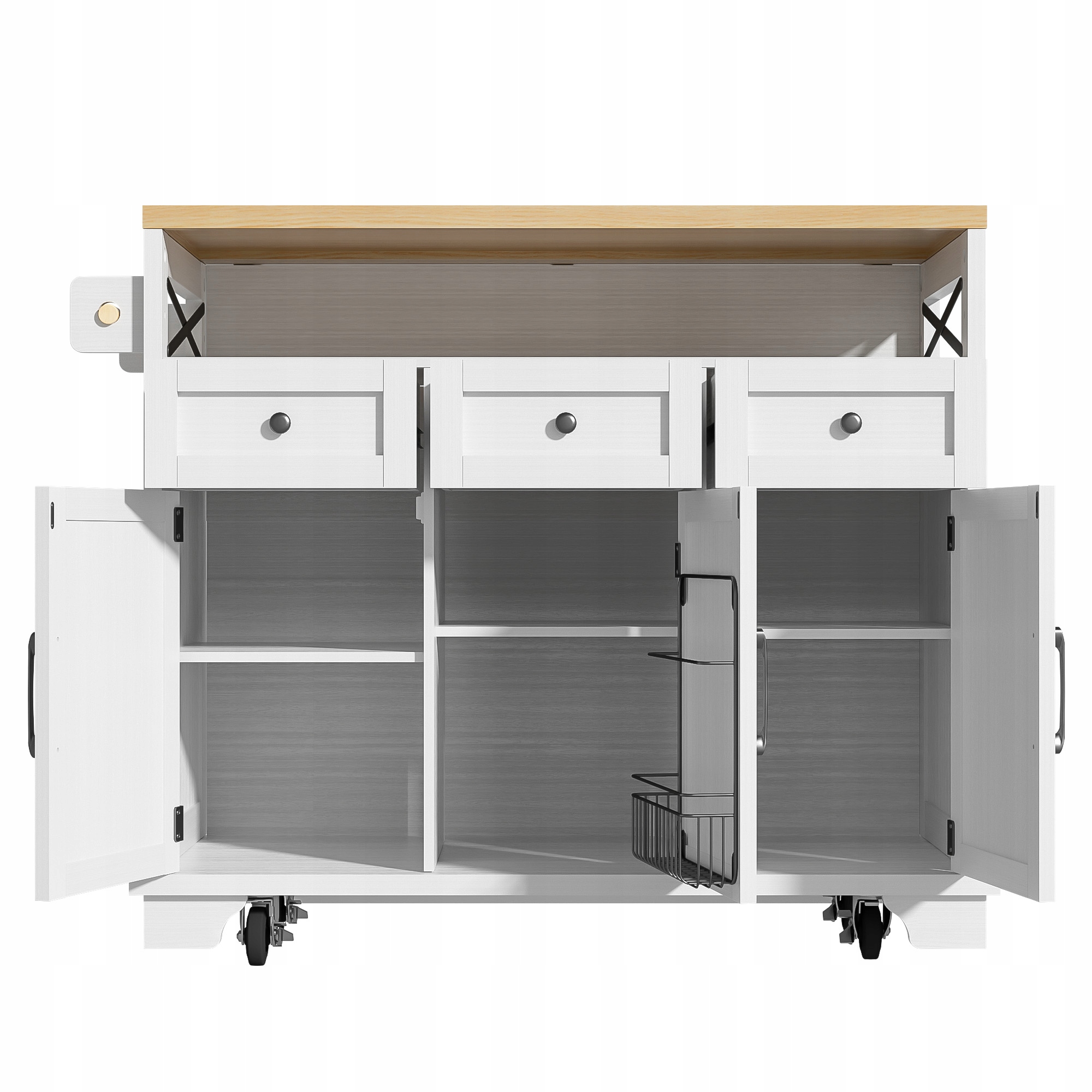 Сучасний кухонний острів (118 × 43 × 98 см) кухонна шафа, їдальня з обідньою візкою з дерев’яним зерном на колесах з багатофункціональним приміщенням для зберігання, знімними відсіками, з рушником, білою