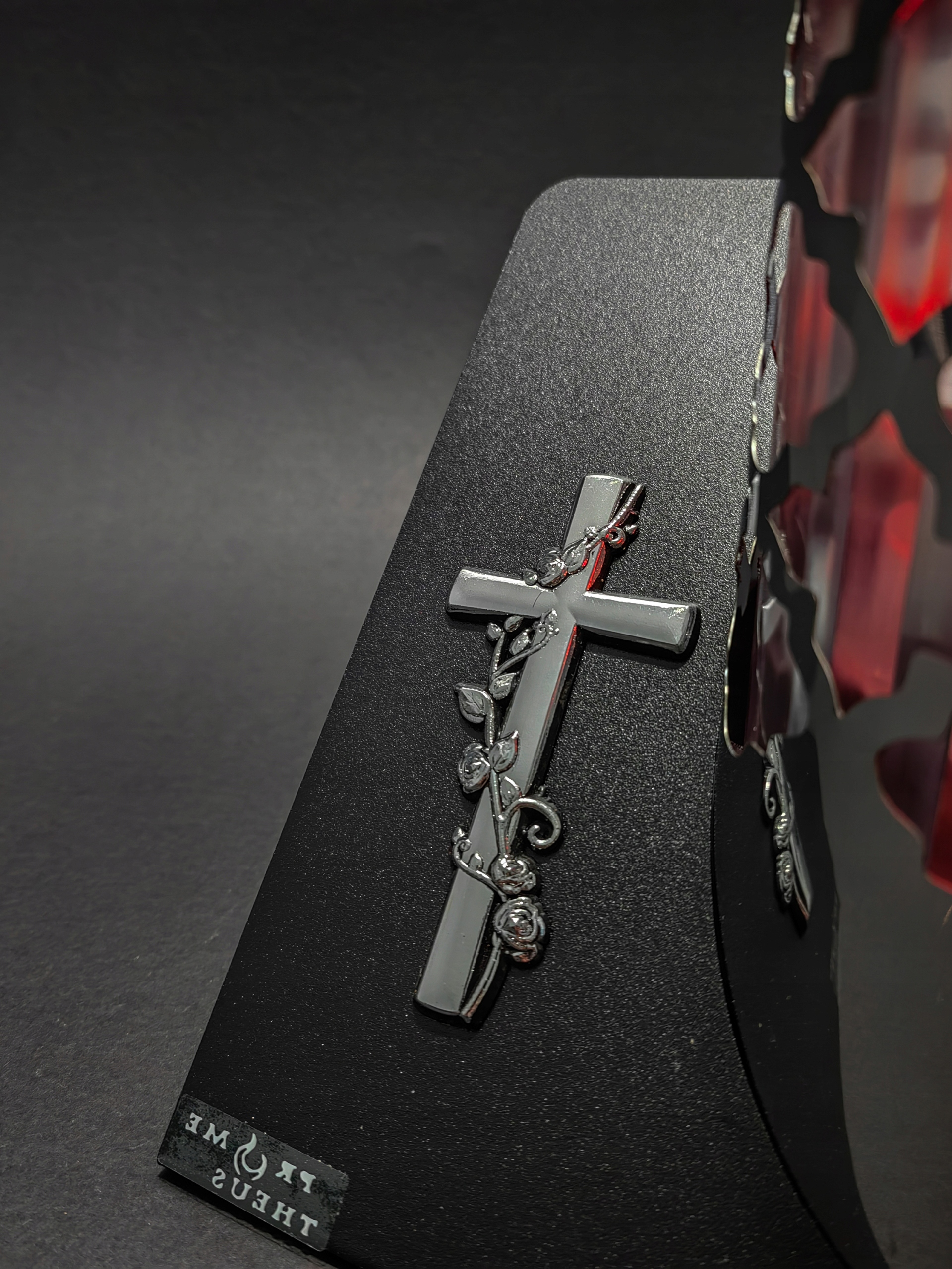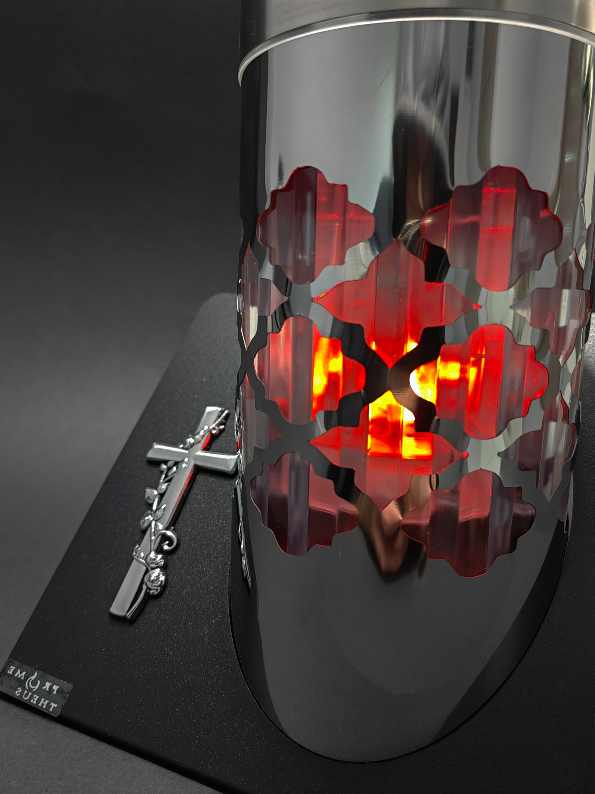 Чудова сучасна сонячна свічка з металу. Труба з вирізаними прикрасами виготовлена з високоякісної сталі. Всередині знаходиться гофрована трубка з безбарвного пластику, яка додатково розсіює світло світлодіодної вставки, що живиться від сонячної батареї.