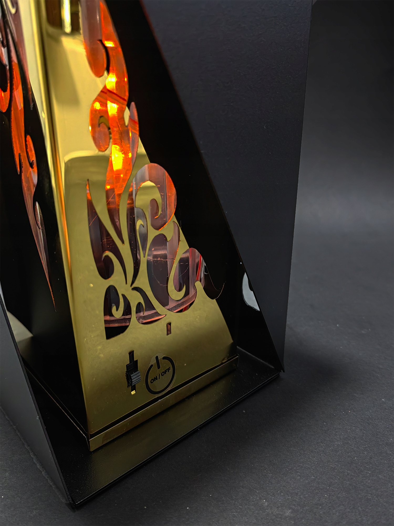 Чудова, сучасна сонячна свічка, виготовлена з металу. Зовнішні, чорні елементи, завершені матовим лаку, внутрішня кришка, виготовлена з золотистої хромованої сталі. На вершині є сонячна панель, що постачає світлодіоди, що імітують природний колір свічки. 11x11cm