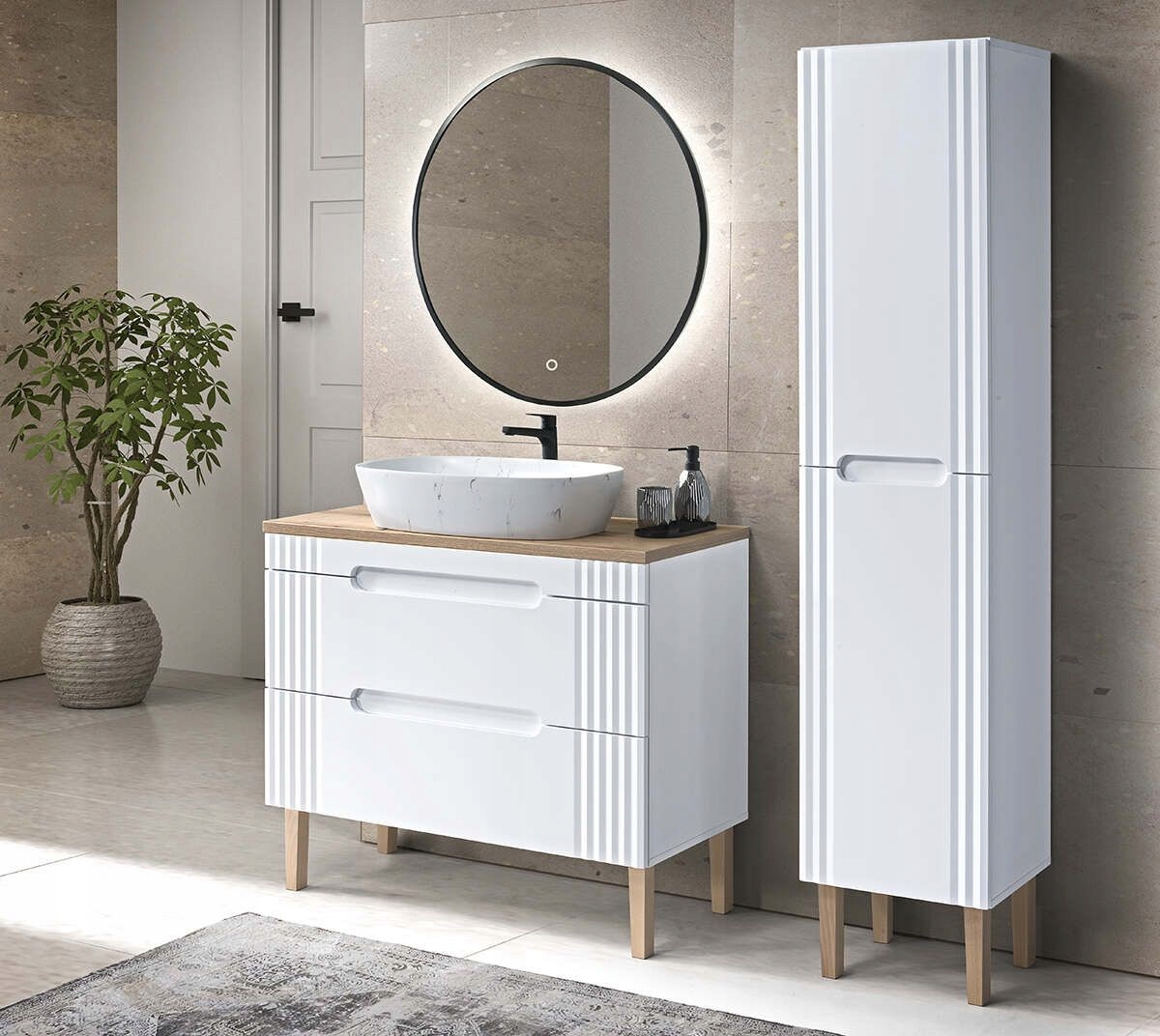 Набір меблів для ванної кімнати , сучасний, фіджа, білий, килим. Сучасний та надзвичайно ефективний набір меблів для ванної кімнати з ергономічною функціональною системою. Завдяки сучасному та універсальному стилю, він дозволяє забезпечити велику свободу в домовленості . Спеціальний предмет меблів ідеально підходить для кожної ванної кімнати, , не займаючи занадто багато місця .
