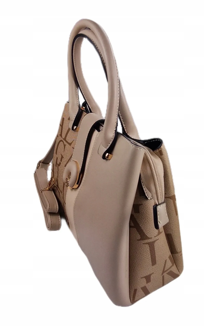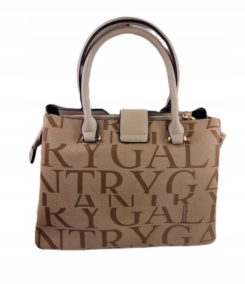 Сумка на фото має елегантний класичний дизайн. Складається з двох основних кольорів: світло-бежевий на бічних панелях і ручках і кремово-бежевий в центральній частині. З одного боку візерунок з великими літерами «ALY» і «GALINARE» - ймовірно, символ бренду. Центральний вертикальний ремінь є декоративним і також утримує золоту круглу пряжку, яка додає сумці шику. Ручки суцільні і злегка закруглені, що робить їх зручними для носіння. Сумка підходить як для щоденного використання, так і для офіційних випадків.