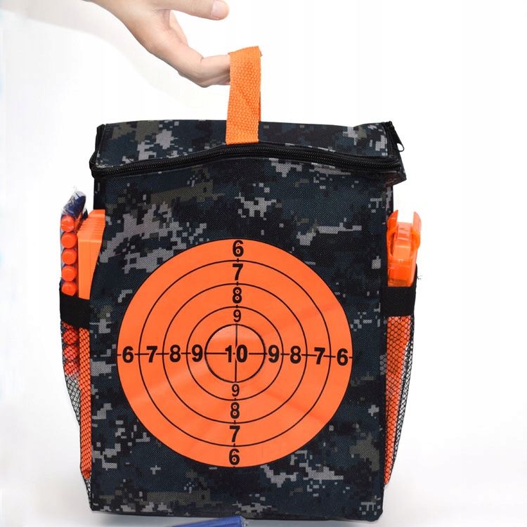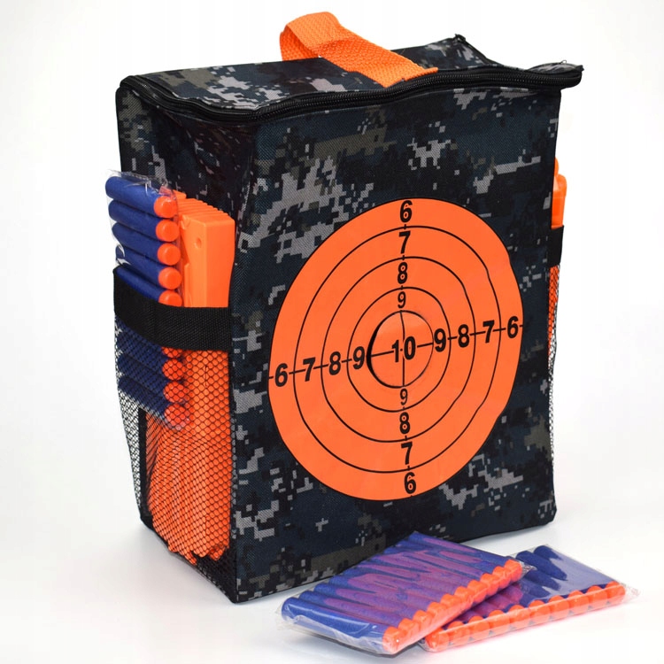 Ось містка сумка, яка вміщує сотні дротиків і багато аксесуарів Nerf. Ви можете брати його куди завгодно, а спеціально надрукована мішень допоможе вам підвищити точність.
