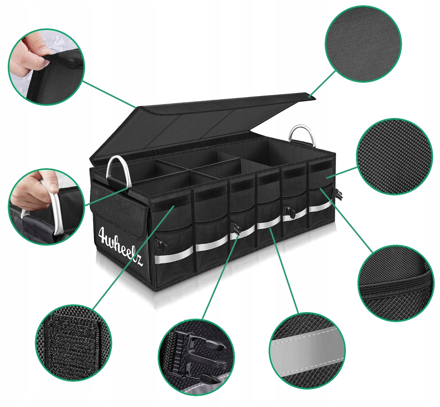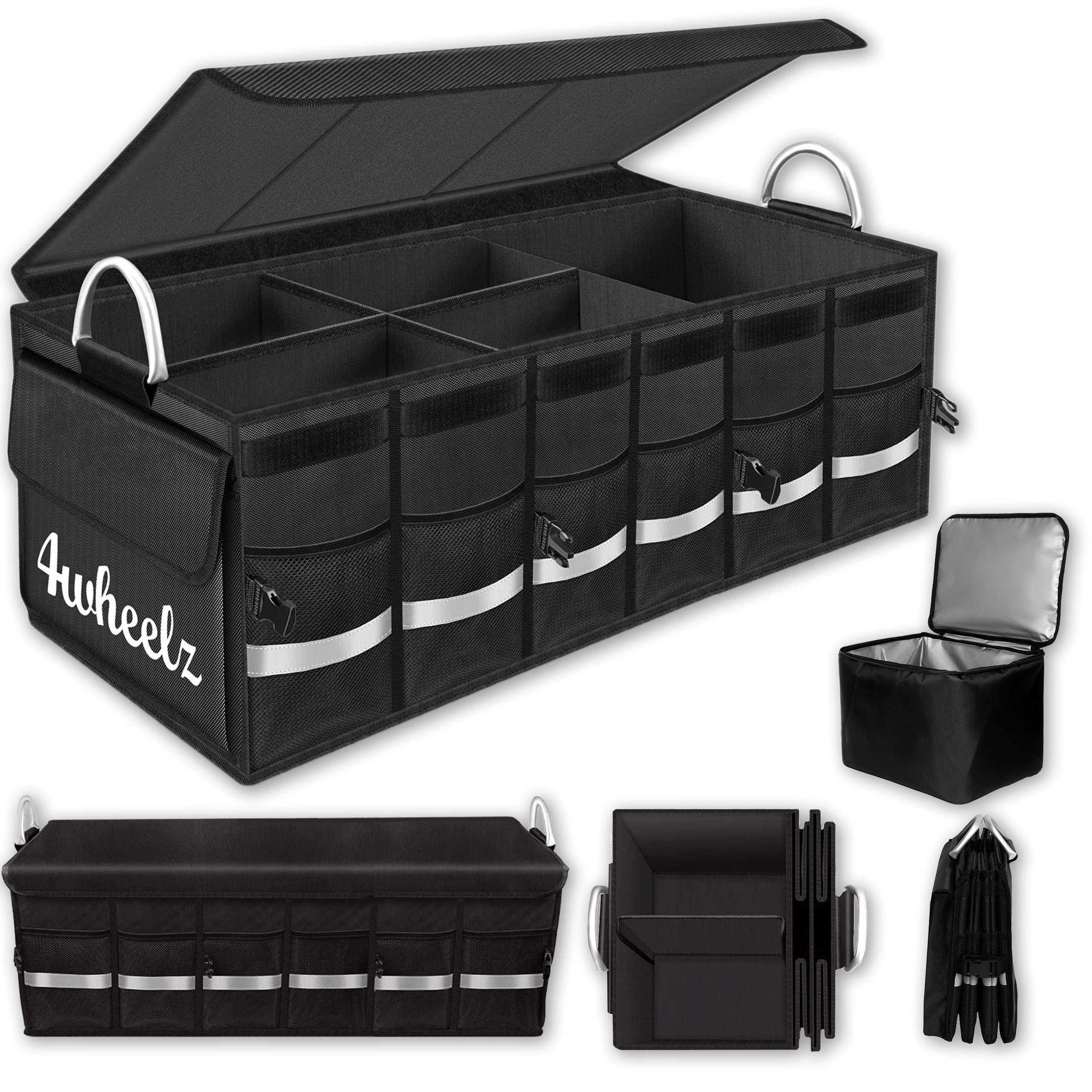 Essen — це ідеальний автомобільний органайзер, який забезпечує порядок у кожному багажнику. Продумана конструкція дозволяє використовувати його відповідно до ваших потреб. Органайзер можна використовувати цілком, розділити на частини або зменшити на 2/3. Він міцно виготовлений з матеріалів найвищої якості з подбали про кожну деталь. Завдяки матеріалу OXFORD 1680D він має підвищену міцність і стійкість до пошкоджень і є водонепроникним. Автомобільна сумка має суцільні алюмінієві ручки, кришку на липучці, міцну прошивку та нековзкі ніжки, що робить її стійкою в багажнику . Окрім містких внутрішніх відділень, він також має зовнішні сітчасті кишені та велику бічну кишеню на липучці. З міркувань безпеки сумка оснащена відбивачами. Модель після упаковки приймає форму невеликої валізи і займає дуже мало місця. У комплект також входить термосумка об'ємом 25л. Органайзер Essen - це дуже місткий і надійний автомобільний органайзер, який дозволить вам організувати всі речі у вашому автомобілі.