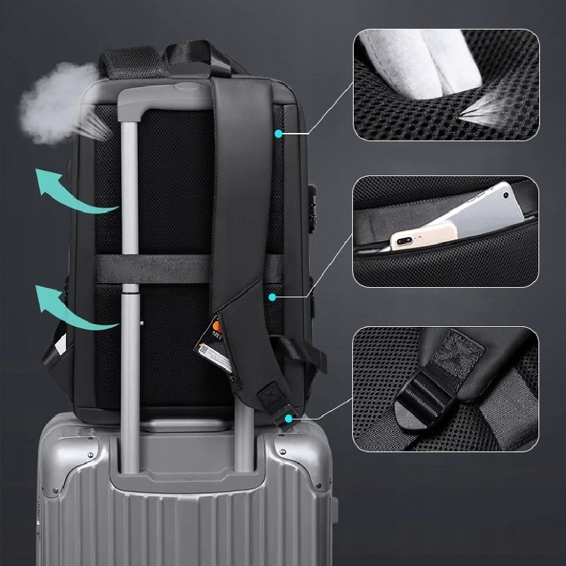 - Він також має ручку для розміщення рюкзака на ручці дорожня сумка.