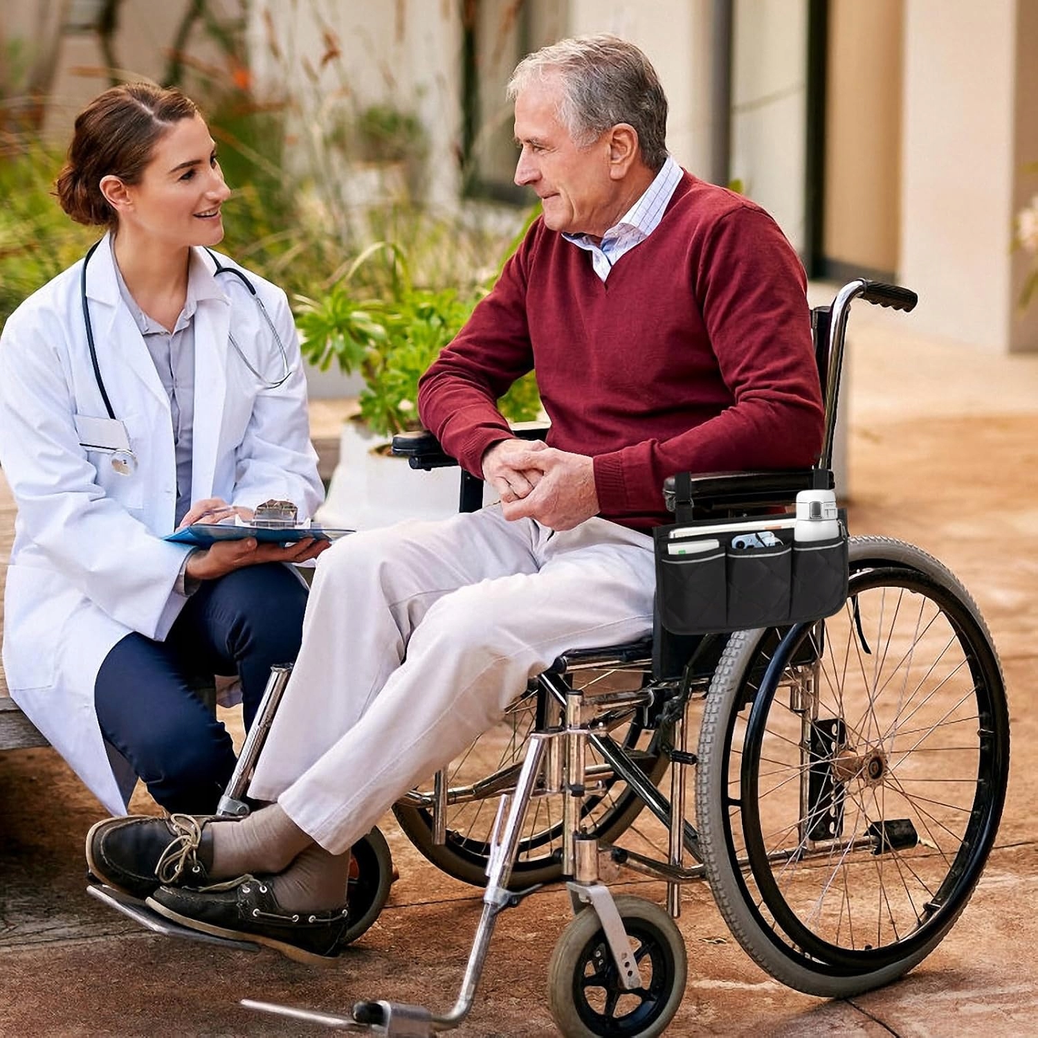 Практичний рюкзак-організатор, розроблений спеціально для кріплення на підлокітнику інвалідного візка, є важливим доповненням до людей в інвалідному візку та їхніх опікунів. Функціональний, легкий та просторий, з трьома відділеннями, полегшує зберігання та транспортування необхідних предметів, забезпечуючи при цьому зручність та легкий доступ до повсякденних предметів.