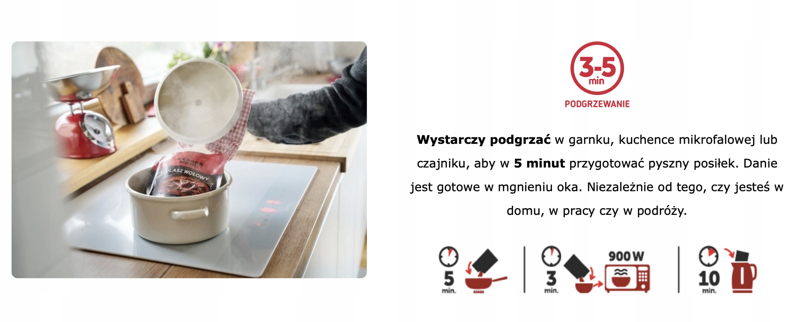 Продукти Експрес Меню пройшли повну термічну обробку. Тому їх приготування передбачає лише розігрів (звичайно, їх можна їсти і холодними). Вам не потрібно додавати воду або варити їжу. Завдяки цьому страву можна приготувати всього за кілька хвилин і подати до столу. Переваги продукту