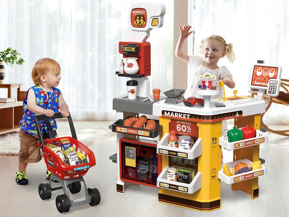 - Супермаркетний магазин з великою кількістю аксесуарів, безумовно, радує кожного маленького продавця. Набір був повністю виготовлений з пластику червоним та жовтим кольором. Супермаркет, оснащений кондитерською, кавоваркою, холодильником та кошиками для покупок. Термінал каси живиться на батареї AA 2X 1.5V AA Після натискання клавіш, читач живиться від батарей AAA 2X 1.5V AAA Після натискання кнопки датчика, світло сканування засвітиться, і звук читача вийде, що, безумовно, зробить задоволення ще більш реалістичним. Додатковою привабливістю супермаркету є холодильник, в якому світить світло. Холодильник має ефект серпанку, як у реальних морозильних камерах, все, що вам потрібно зробити, - це вилити воду в бак посередині холодильника. Холодильник видає питний звук. Працює з батареями AA 3x 1,5 В. Діти люблять грати в продаж, купівлю, це також фантастичне навчання через гру.