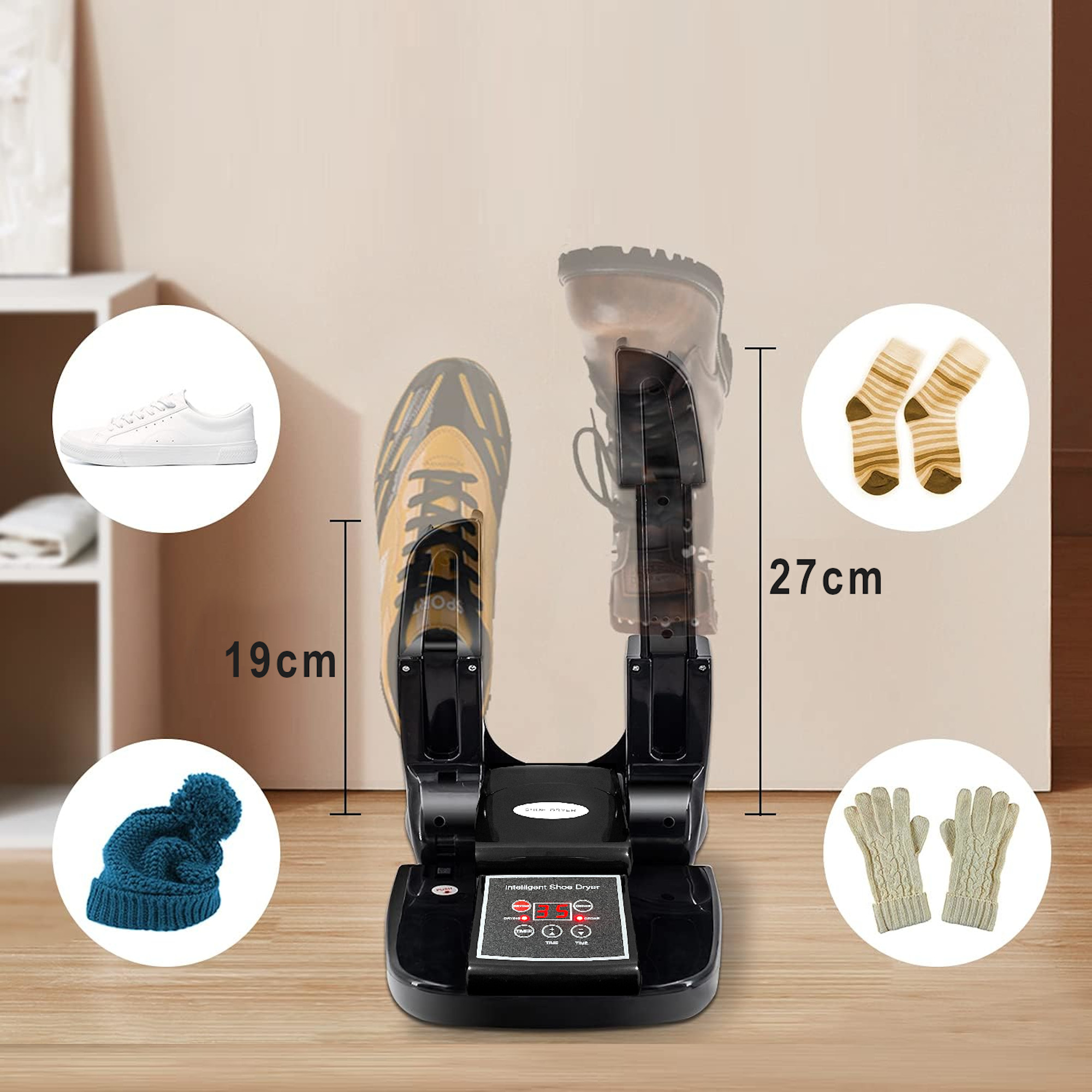 Завдяки регульованій довжині сушильних вставок сушильна машина підходить як для низького, так і для високого взуття.