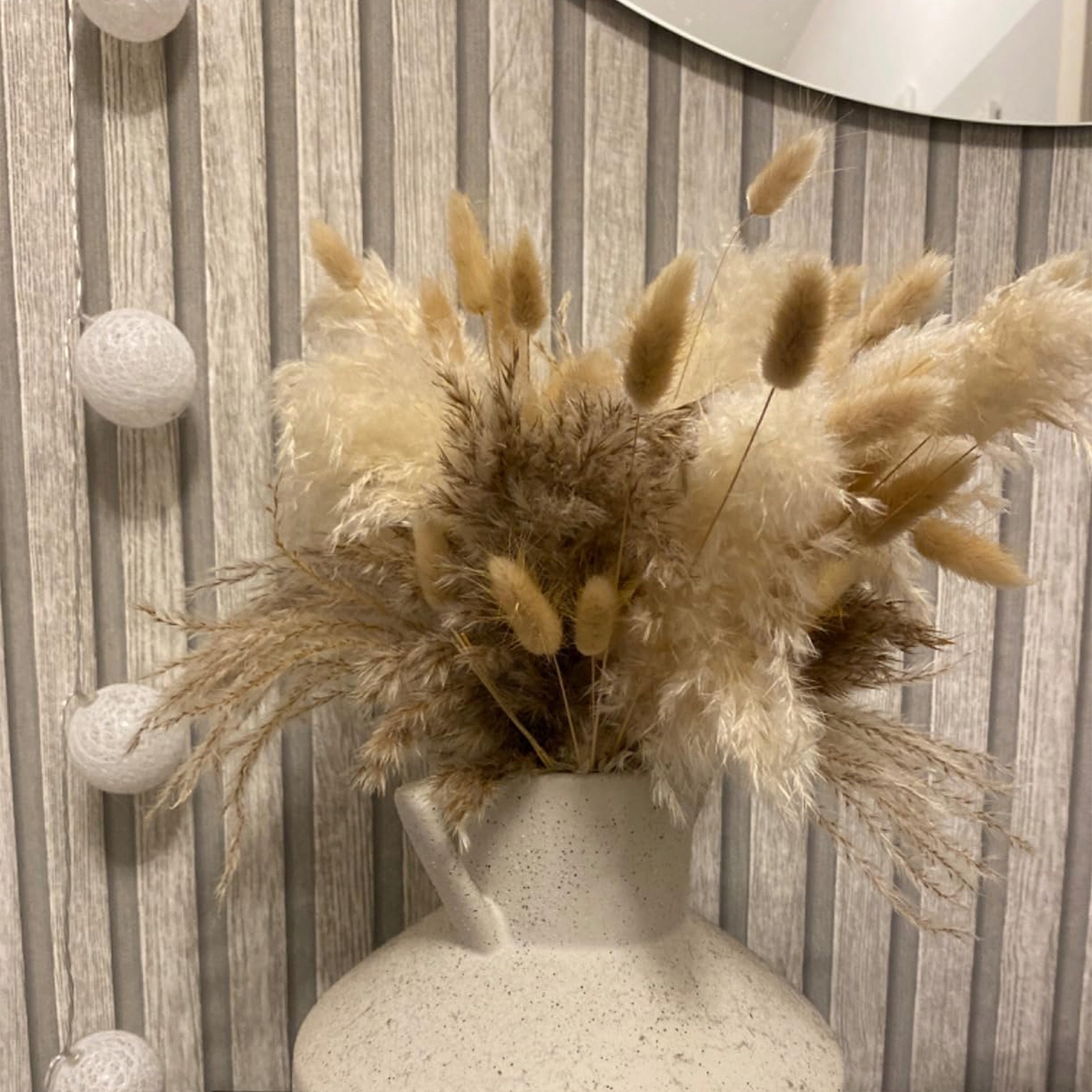 Наш оптовий букет із пампасної трави включає 50 натуральних висушених квітів кролячого хвоста, 15 білих сухих квітів кролячого хвоста, 20 мініатюрних очеретів, 15 білих очеретів, 15 коричневих очеретів, 5 білих очеретів і 5 коричневих очеретів, 125 шт. в цілому. Цієї суми більш ніж достатньо.