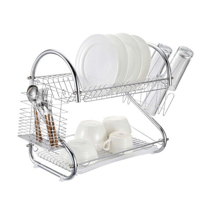 Дворівнева сушарка для посуду є обов'язковим елементом обладнання на кожній кухні. Він дуже практичний, має два рівні, на яких легко розміститься велика кількість тарілок, мисок і склянок. Крім того, він має дві підвісні ручки. Один для столових приборів, інший для склянок.