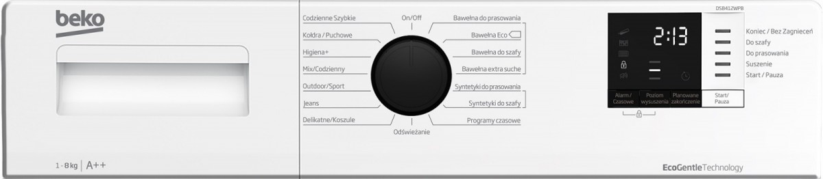 - Програми та опції сушіння: Бавовна/Екобавовна, Щоденна, Делікатна (м’яка), Джинси, Сорочки, Пухові ковдри, Змішана, На вулиці, Освіжаюча , Пір'я/Пух, Швидкий/Короткий, Синтетика, Спорт/Фітнес