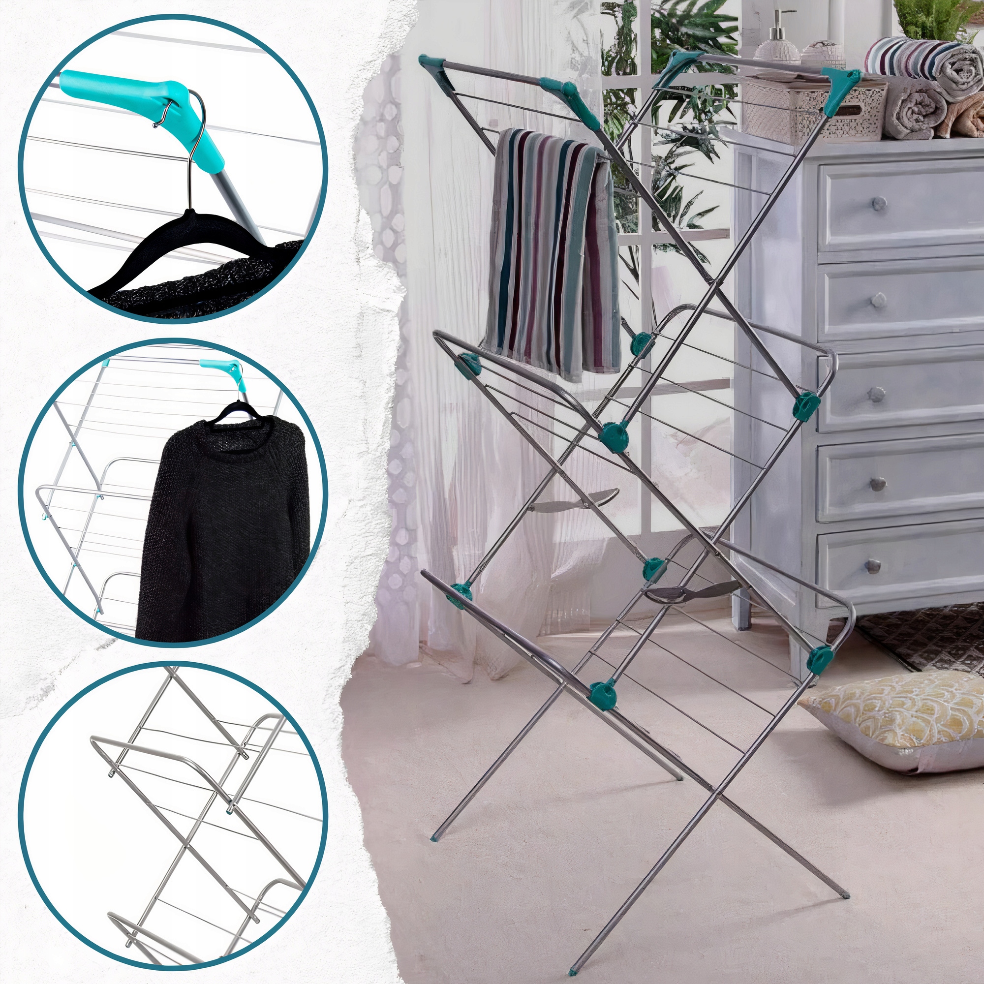 Окремо стояча вертикальна сушильна машина не тільки забезпечить багато місця для вашого одягу – вона має 6 складних стулок / 2 штанги на кожен, а також заощадить дорогоцінний простір у вашій квартирі.