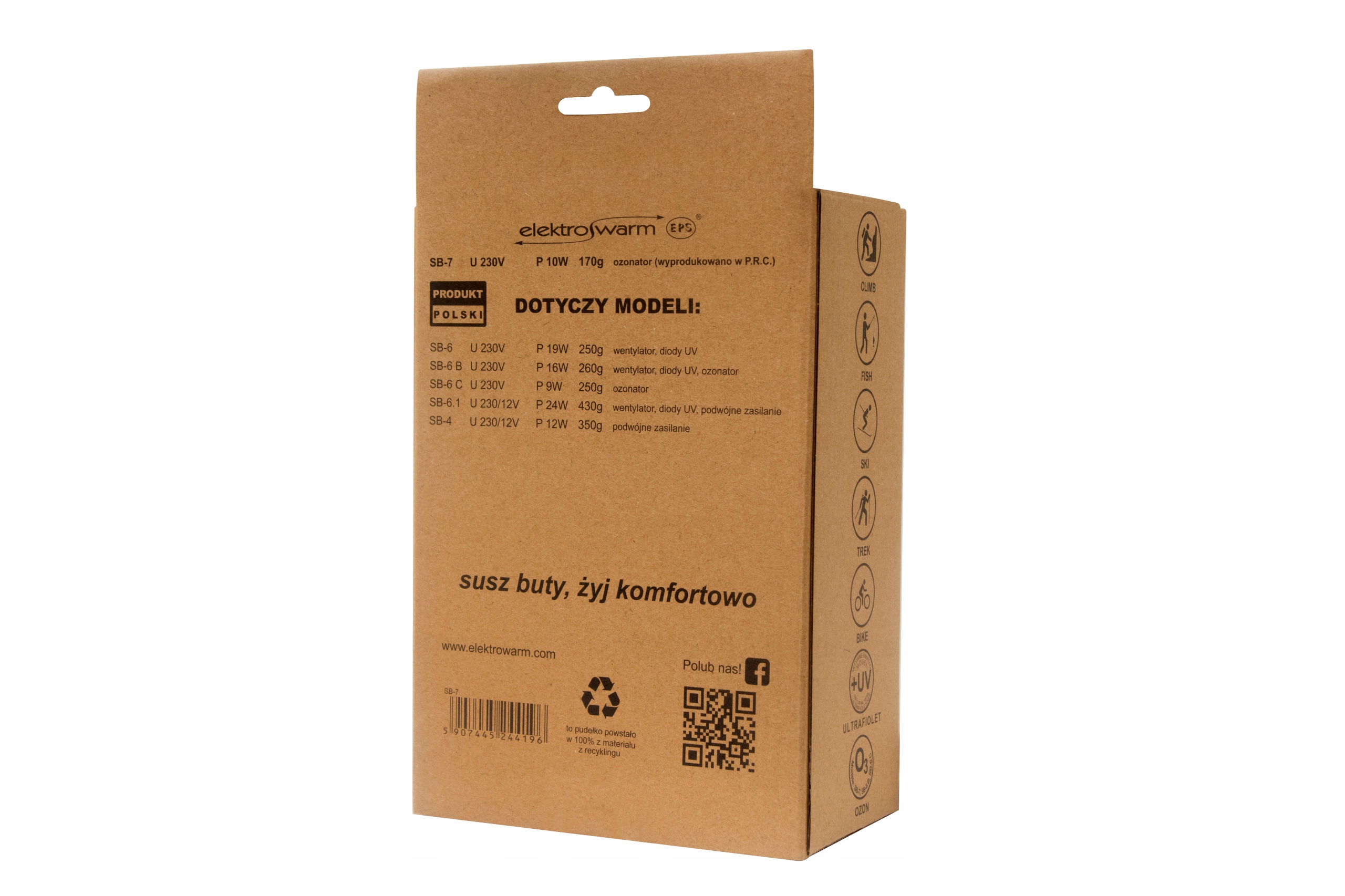 Модель SB-7абсолютно унікальна. і перша на ринку сушарка з озоновим стерилізатором. Поки що озон використовується, в тому числі, для знезараження питної води. Тепер ви можете дезінфікувати висохле взуття, шоломи, рукавички, шкарпетки та головні убори ефективним, надійним і простим способом. Щоб висушити або продезінфікувати взуття, поставте обидві сушарки у взуття по всій довжині стопи. Залиште на 1-4 години залежно від ваших потреб. Після ввімкнення сушильна машина автоматично працює в режимі сушіння. У будь-який момент ми можемо включити функцію озонування, яка триває 10 хвилин і є достатньою для ефективної стерилізації взуття. Ви можете будь-коли знову ввімкнути функцію озонування. Під час озонування не працює нагрівач сушарки. Сушарки повністю безпечні для взуття (не викликають деформації та пошкодження взуття).