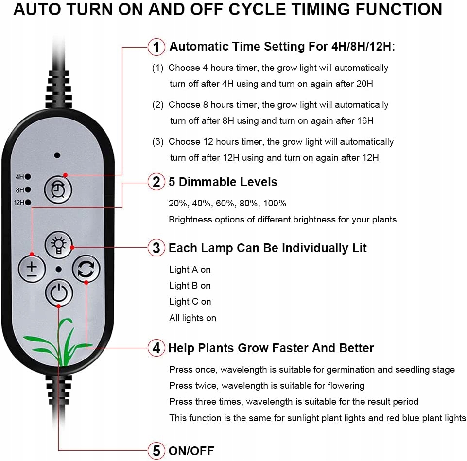 Кілька режимів вибору: Світлодіодний світильник для рослин Bufccy з 3 головками може мати 5 параметрів затемнення. Натискання кнопки «±» змінює інтенсивність світла (20%, 40%, 60%, 80% і 100%). 3 режими світлодіодного спектру: червоний світлодіодний спектр увімкнено / синій світлодіодний спектр увімкнено / червоний і синій світлодіодний спектр увімкнено. 3 керованих режими перемикача: одна лампа, дві лампи або три лампи. гнучкі для задоволення потреб у вирощуванні рослин на різних етапах.