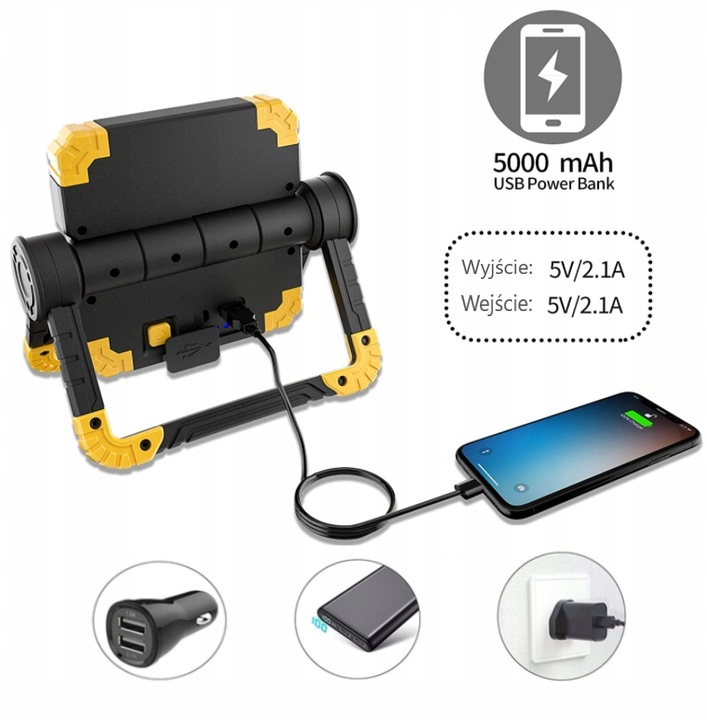 Завдяки USB-виходу ви можете заряджати свій телефон або інші пристрої! Однак вхідний порт дозволяє заряджати батарею лампи через автомобільну розетку банк живлення або вилка!